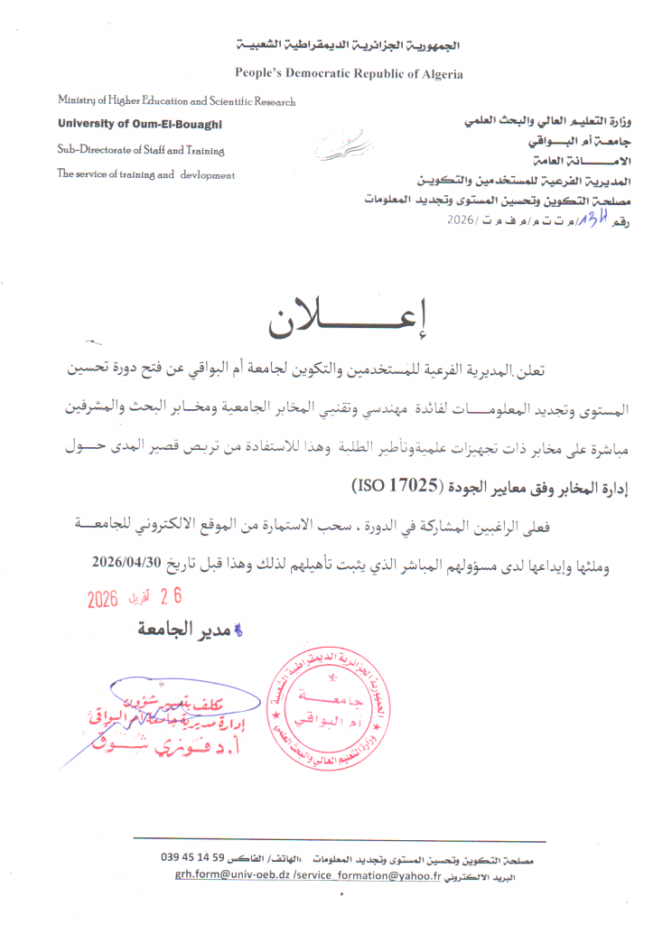 إعلا ن عن تربص قصير المدى حول إدارة المخابر وفق معايير الجودة iso 17025