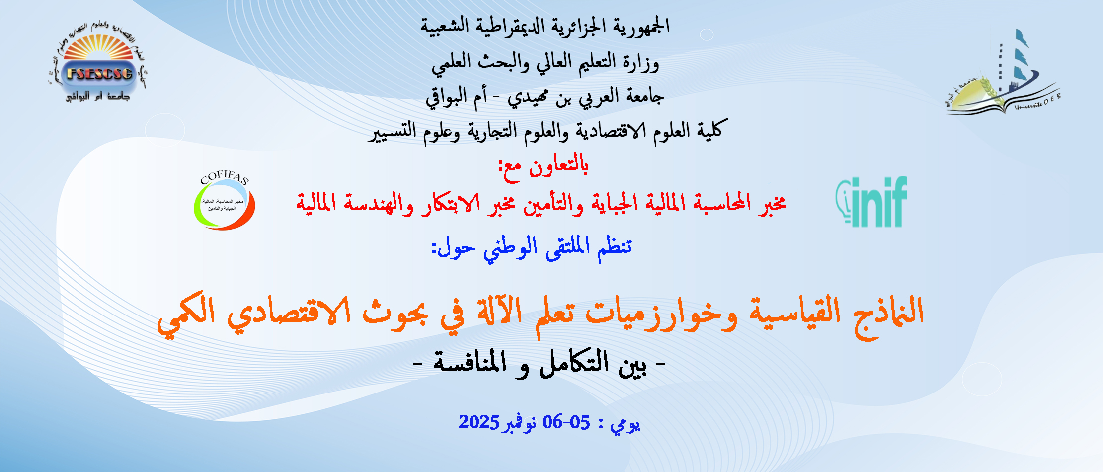 الملتقى الوطني حول: النماذج القياسية وخوارزميات تعلم الآلة في بحوث الإقتصادي الكمي بين-التكامل و المنافسة-