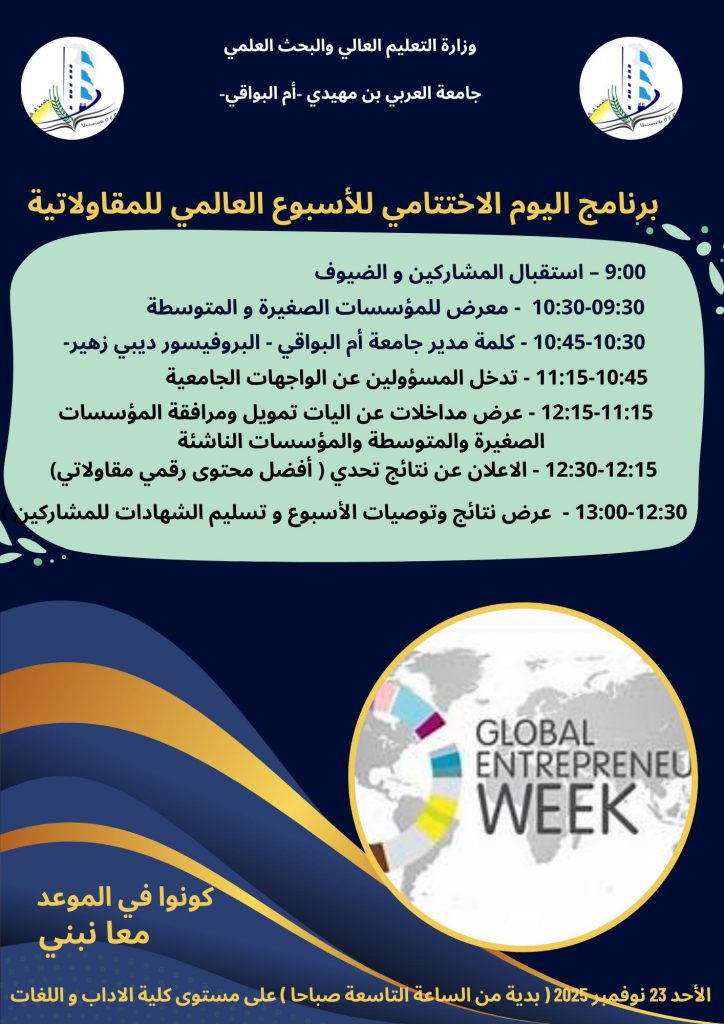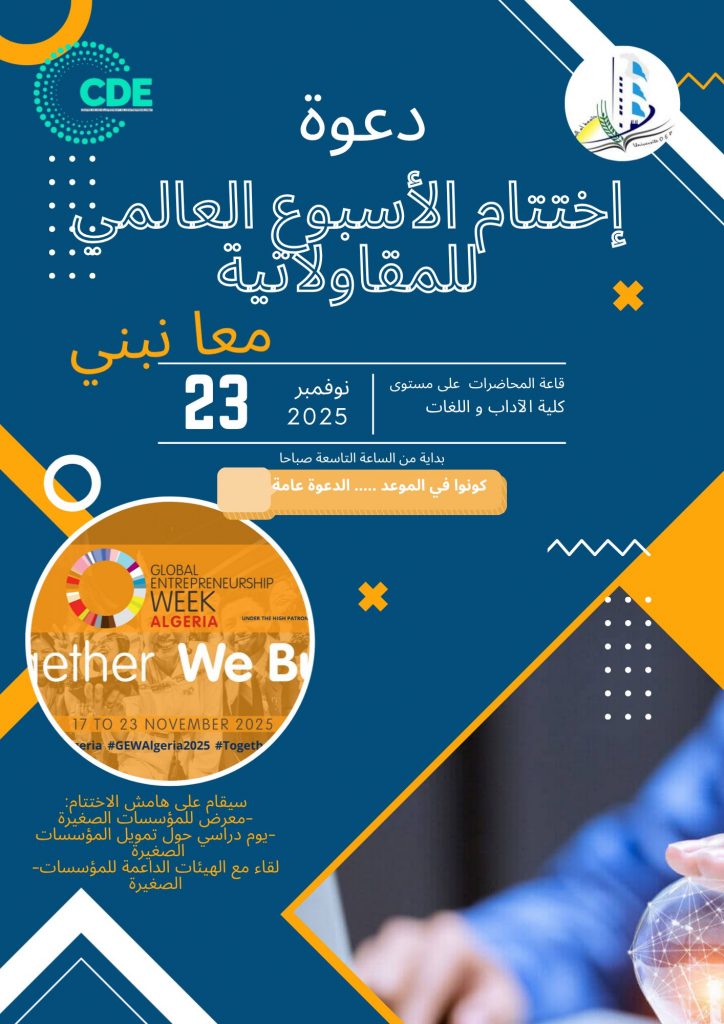 – مناسبة اختتام الاسبوع العالمي للمقاولاتية; والمزمع تنظيمه يوم الاحد 23 نوفمبر 2025 على مستوى كلية الاداب واللغات ( بداية من التاسعة صباحا).