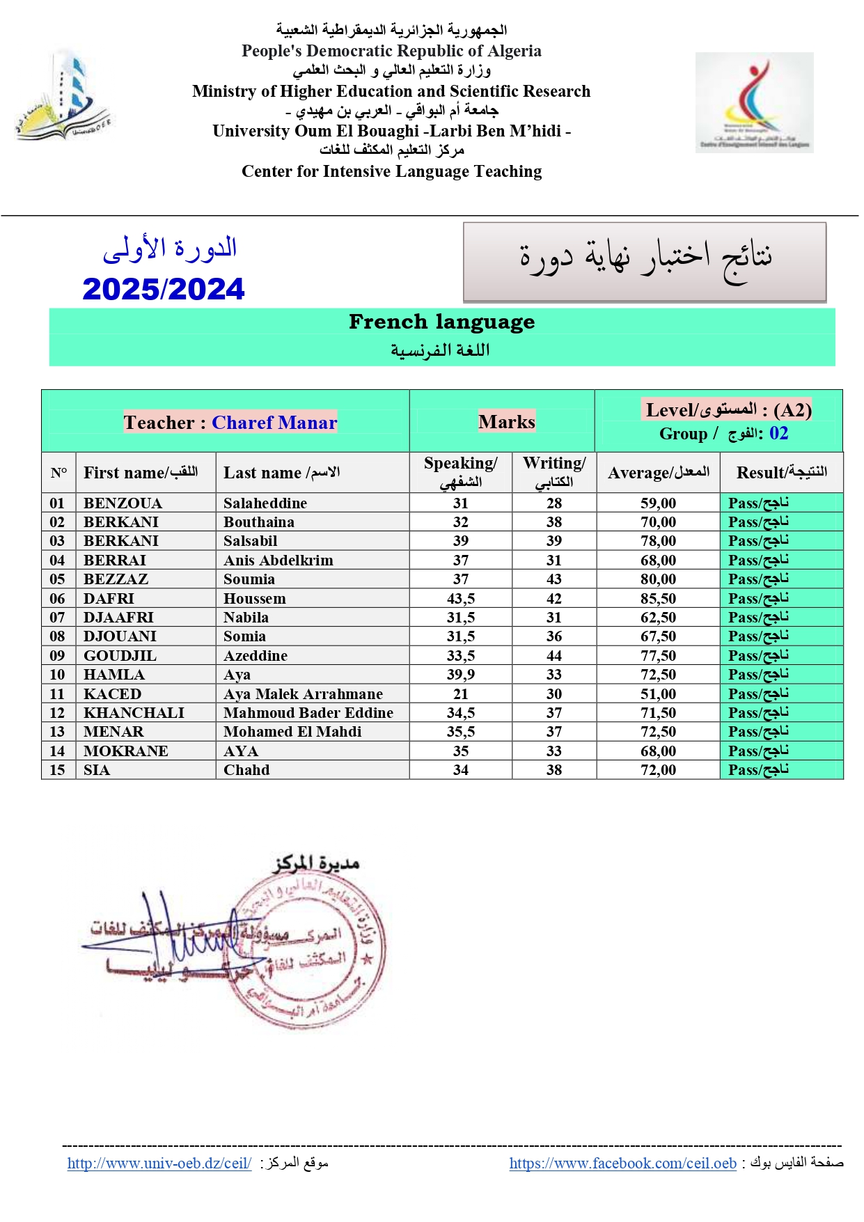 | اللغة | المستوى | الأستاذ | الفوج | النتائج |