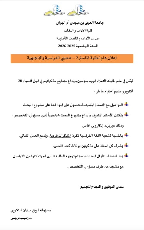 إعلان هام لطلبة الماستر 2 – شعبتي الفرنسية والإنجليزية