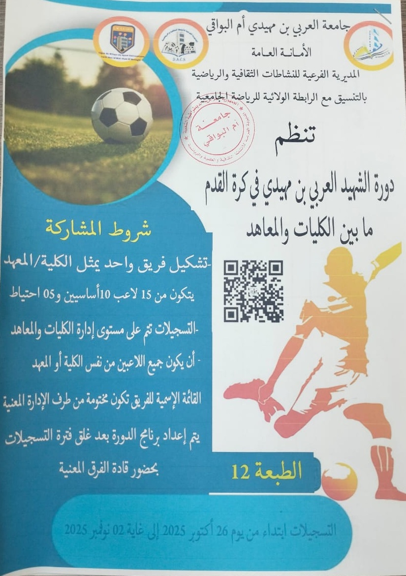 الرئيسية/متفرقات/دورة الشهيد العربي بن مهيدي في كرة القدم ما بين الكليات و المعاهد النشاطات دورة الشهيد العربي بن مهيدي في كرة القدم ما بين الكليات و المعاهد آخر تحديث: 152 أقل من دقيقة إستمارة التسجيل: نسخ الرابط تم نسخ الرابط آخر تحديث: 152 أقل من دقيقة شاركها فيسبوك لينكدإن ماسنجر ماسنجر واتساب تيلقرام ڤايبر مشاركة عبر البريد طباعة