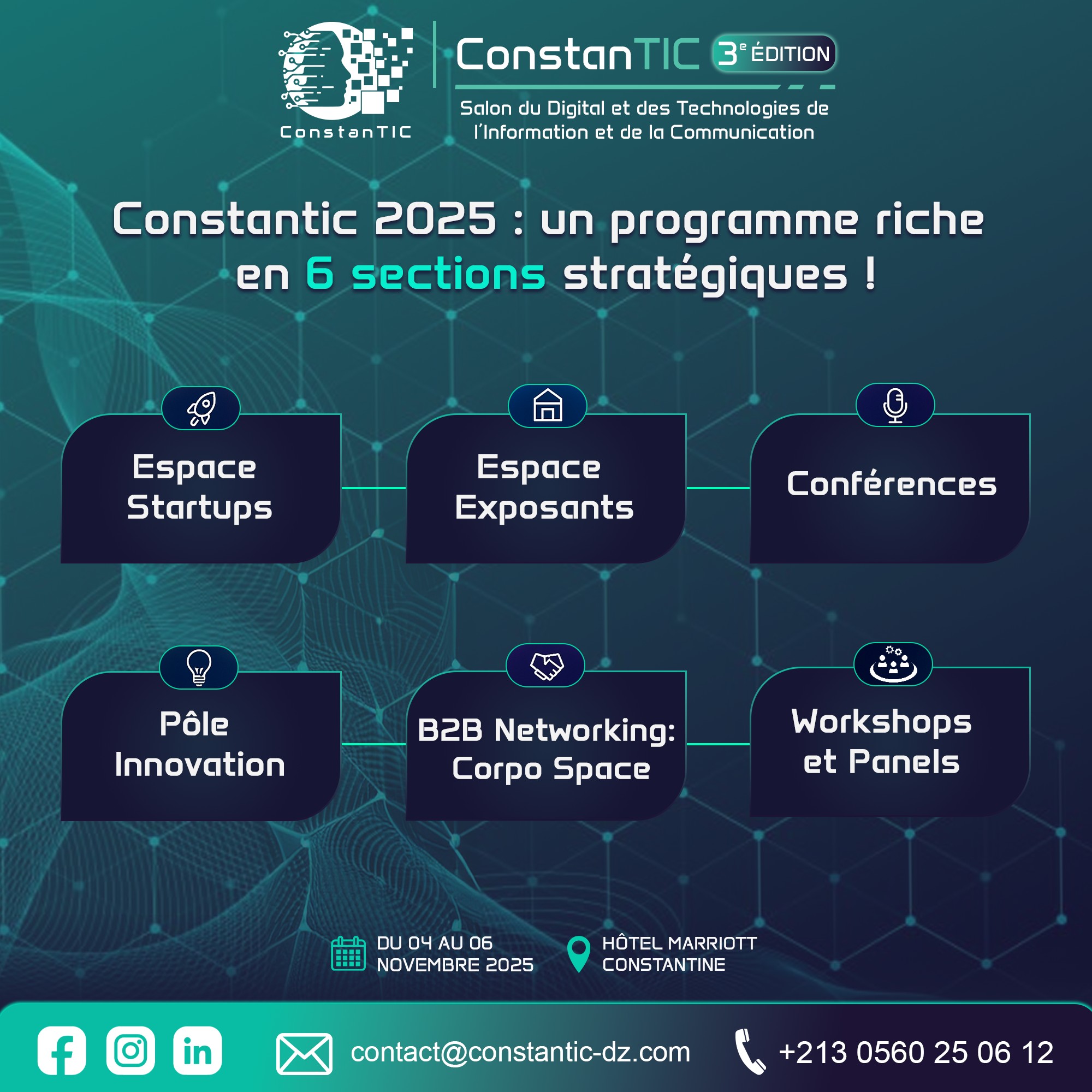 | دعوة إلى الأساتذة و الطلبة المهتمين بمجال الرقمنة و التكنولوجيات الحديثة، للمشاركة في المعرض الدولي الثالث لـ “الرقمنة وتقنيات المعلومات والاتصال” في الجزائر، الذي سيُقام في فندق الماريوت بمدينة قسنطينة في الفترة من 4 الى 6 نوفمبر 2025 المعرض يهتم بالمحاور التالية: شبكات الجيل الخامس والاتصالات – الأمن السيبراني – الذكاء الاصطناعي – الحوسبة السحابية – البيانات الضخمة – إنترنت الأشياء – الصحة والتعليم الرقمي – الشمول الرقمي والأخلاقيات – التشريعات الرقمية …. المعرض يشهد تقديم محاضرات من طرف أساتذة و خبراء في الميدان |