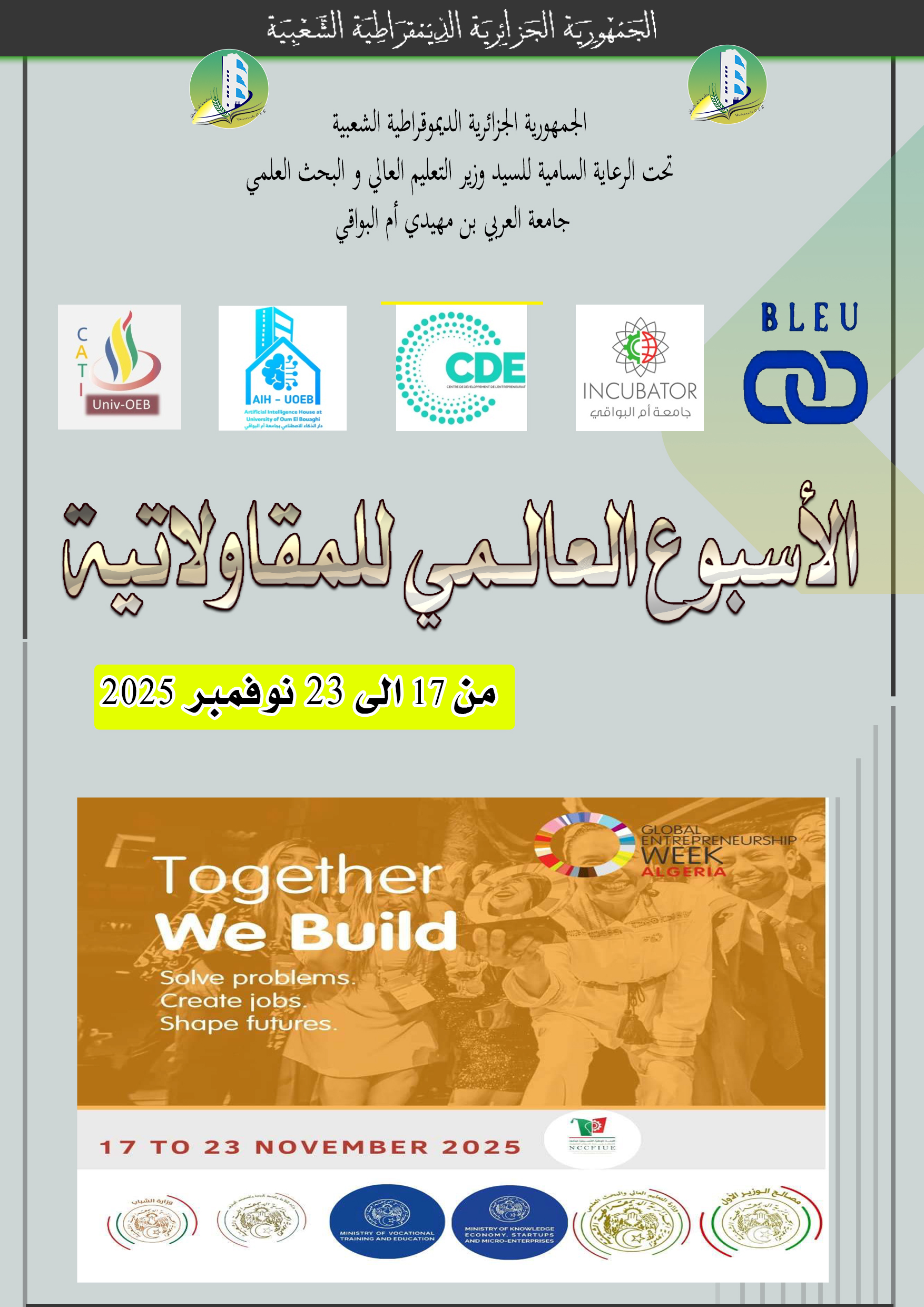 يسرّ جامعة أم البواقي أن تعلن عن تنظيم النسخة الخاصة من الأسبوع العالمي للمقاولاتية، وهو حدث دولي يحتفل بروح الابتكار والإبداع ويهدف إلى نشر ثقافة المبادرة وبناء جيل قادر على خلق الفرص وصناعة التغيير. سيعرف هذا الأسبوع سلسلة من الأنشطة الهادفة، من بينها: كونوا جزءًا من هذا الحدث الملهم وشاركونا رحلة اكتشاف الأفكار الواعدة وبناء مستقبل أفضل! #الأسبوع_العالمي_للمقاولاتية #جامعة_أم_البواقي #مبادرة #ابتكار #ريادة_الأعمال |