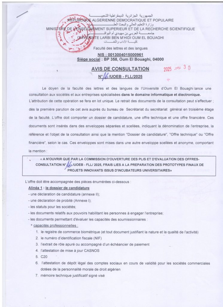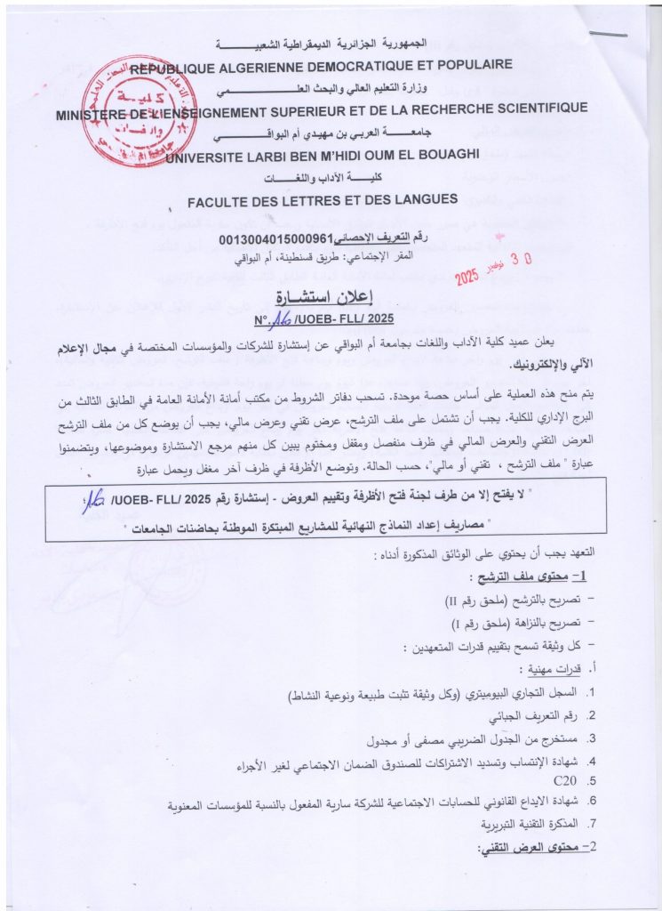 إعلان إستشارة رقم 15 /ج أ ب/ ك آ ل/ 2025