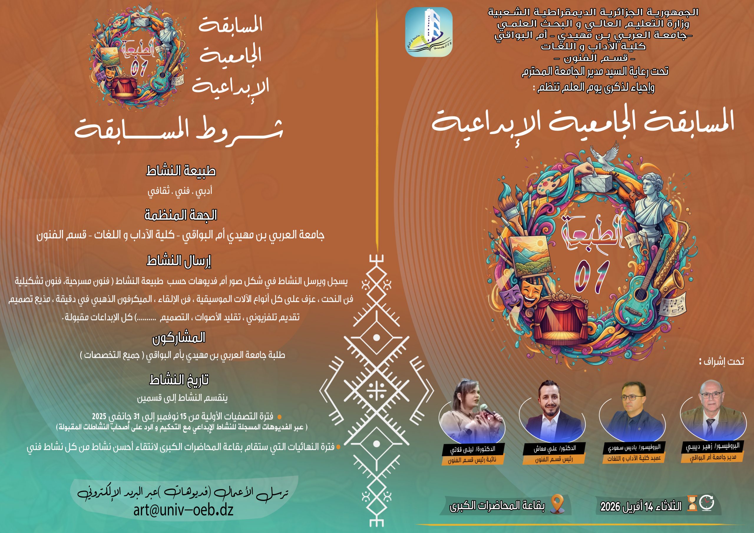 في إطار تعزيز ثقافة الطالب المبدع ، الطالب الفنان ، ندعو طلبتنا الأعزاء والذين يملكون مهارات متعددة في مجال : فنون مسرحية ، فنون تشكيلية ، الموسيقى ، التمثيل ، العزف على كل أنواع الآلات الموسيقية ، فن الإلقاء، التنشيط ، المكرفون الذهبي في دقيقة ، تقليد الأصوات ، المذيع ، التقديم التلفزيوني ، التصميم… كل الإبداعات مقبولة وإن لم تذكر ضمن الإعلان