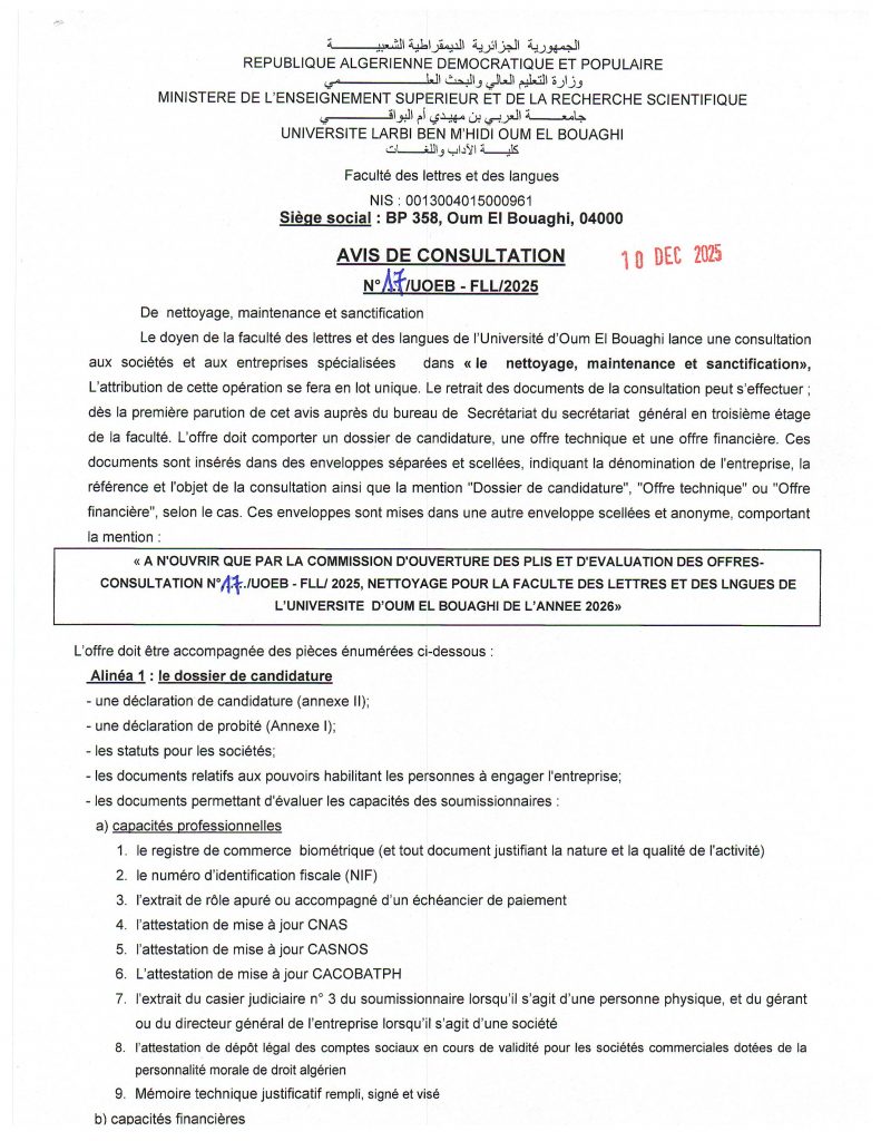 إعلان إستشارة رقم 15 /ج أ ب/ ك آ ل/ 2025