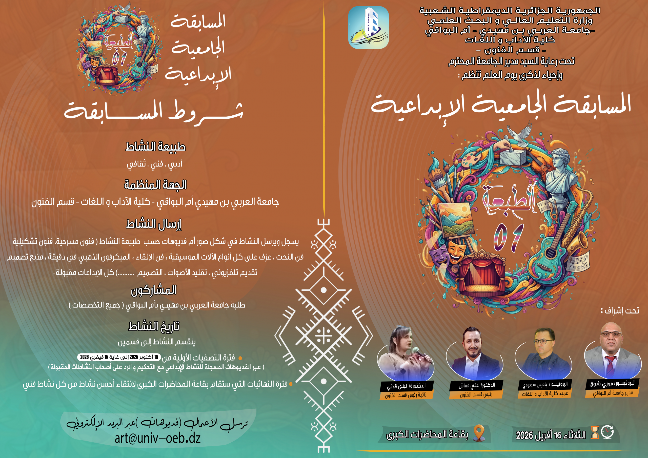 في حالة أي استفسار يرجى التواصل عبر البريد الإلكتروني : art@univ-oeb.dz