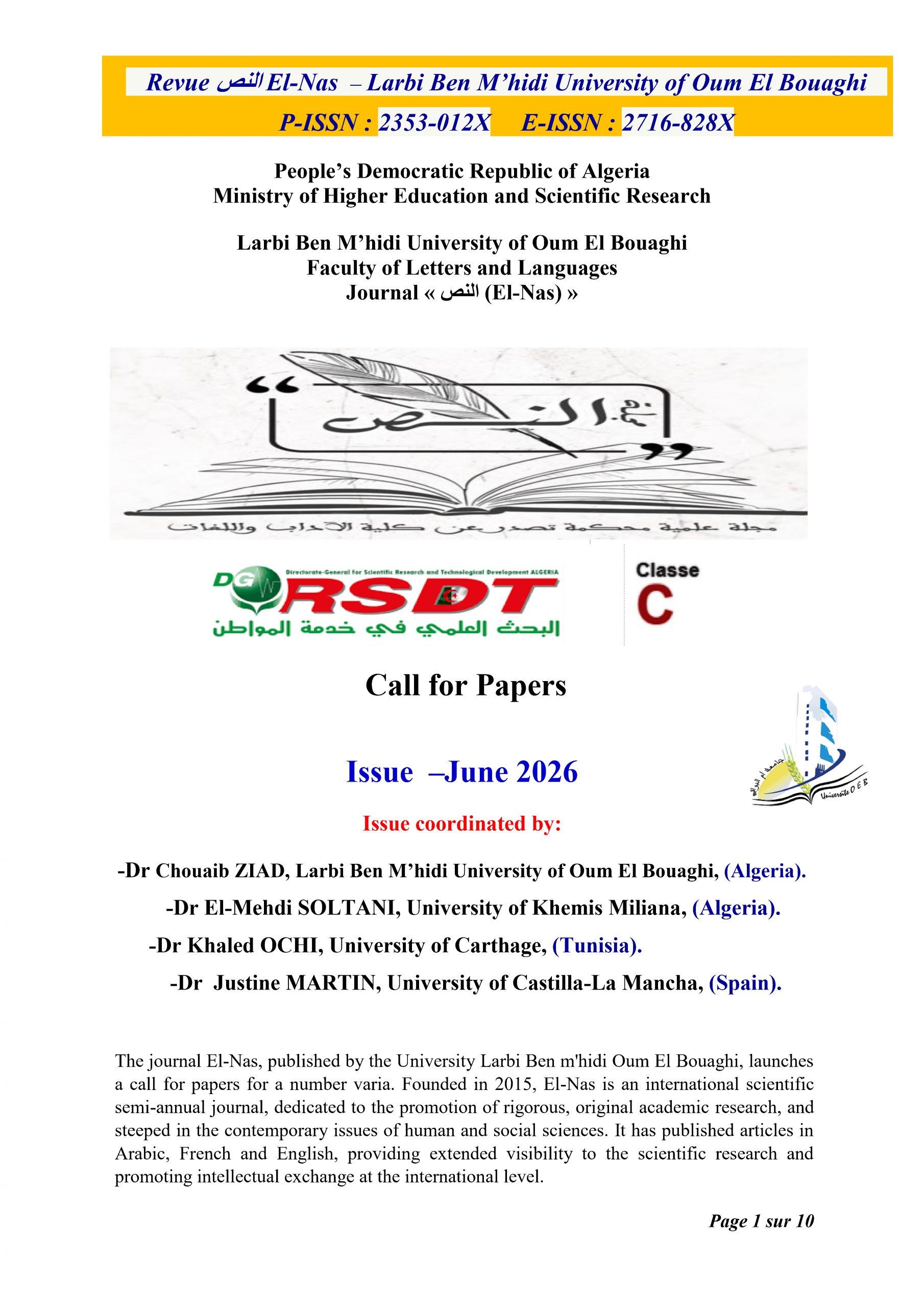 -Dr Chouaib ZIAD, Larbi Ben M’hidi University of Oum El Bouaghi, (Algeria).