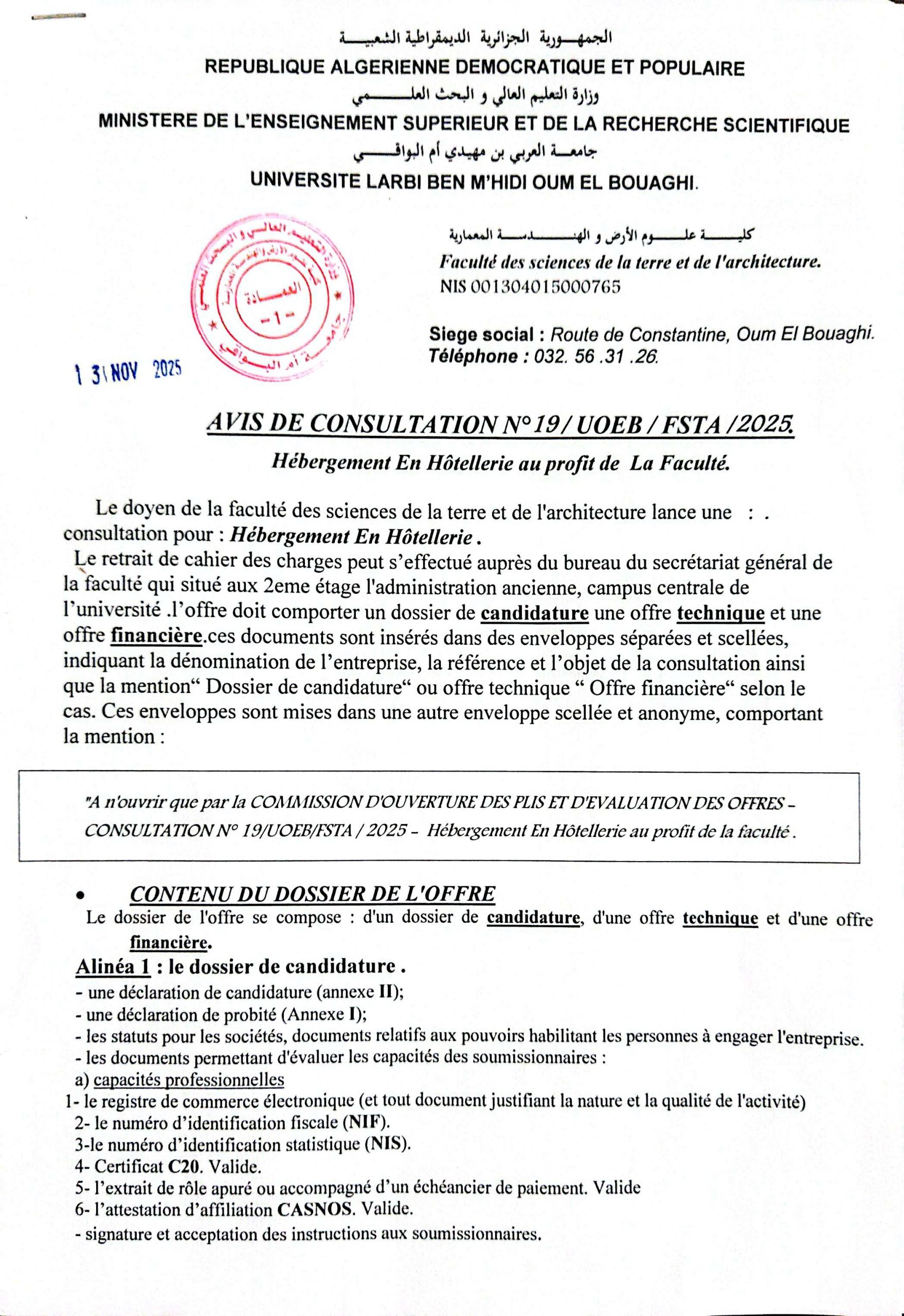يعلن عميد كلية علوم الارض و الهندسة المعمارية عن مناقصة لمن يهمهم الامر الاطلاع على الرابط أدناه او الاتصال بالامين العام