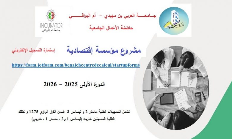 تعلن هيئة حاضنة الأعمال لجامعة أم البواقي عن انطلاق التسجيلات للسنة الجامعية 2025 / 2026، والذي تم نشره في صفحة الجامعة.