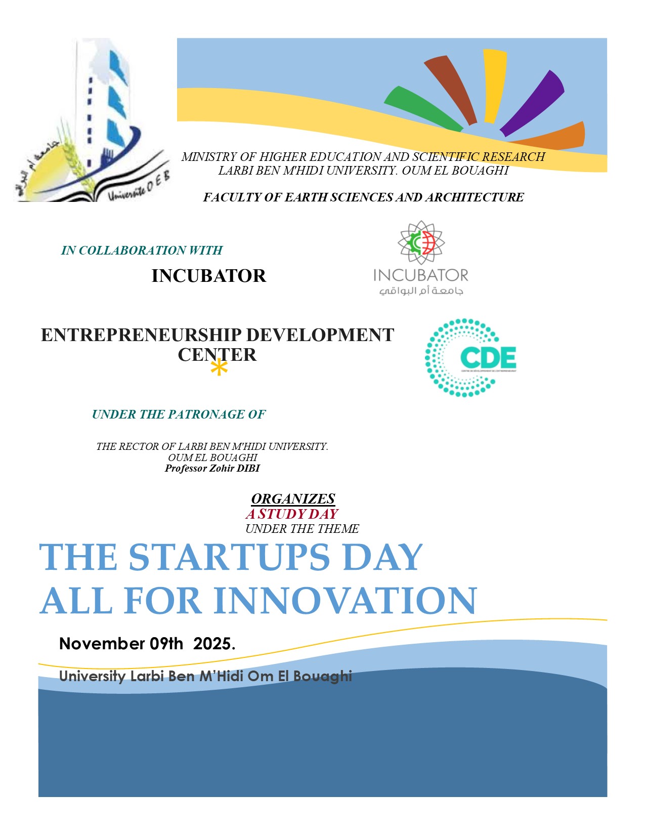 حاضنة الأعمال جامعة ام بواقي بالشراكة مع كلية علوم الارض و الهندسة المعمارية ترحيب بضيوفها الكرام Affiche_Géologieتنزيل Poster_principaleتنزيل Affiche_Facultéتنزيل Affiche_Architectureتنزيل