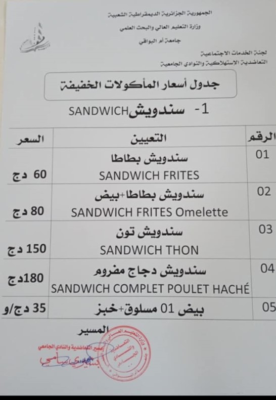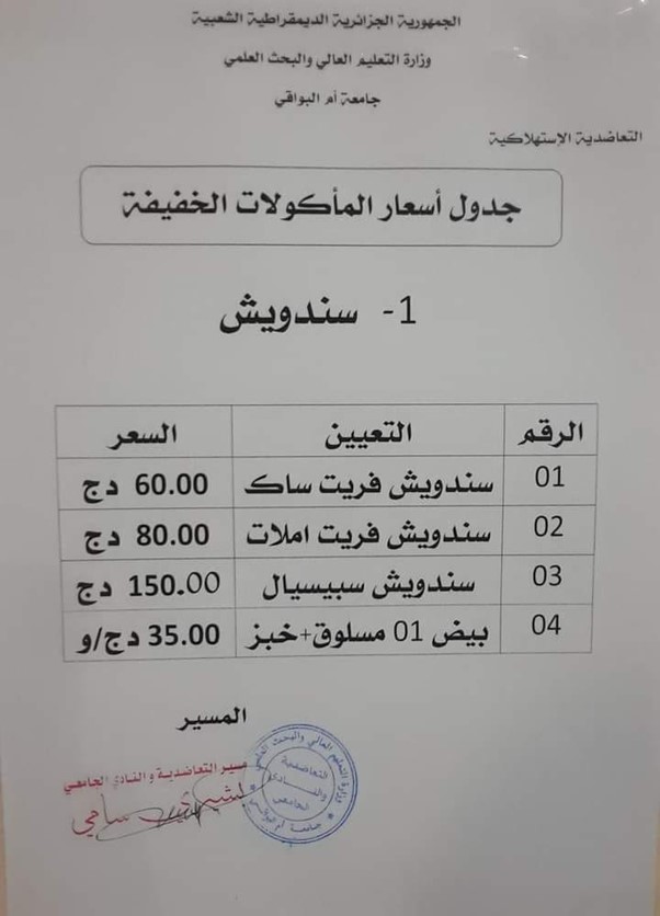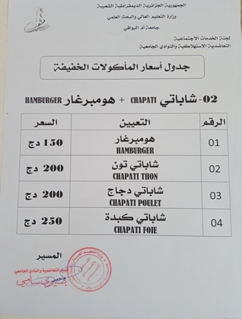 Additionally, as previously stated, Oum El Bouaghi University guarantees the availability of food for students and staff in a series of clubs and stores managed by private sectors or social services for workers. These clubs and shops offer competitive prices for their customers.