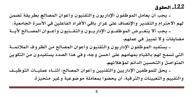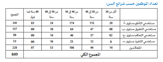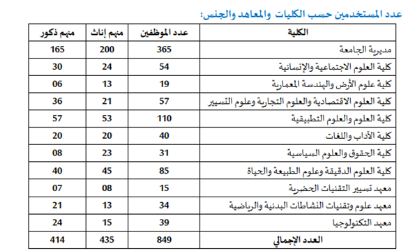 These statistics confirm a convergence in the numbers of employees of both genders, as the total number of employees is 625, distributed across various grades and ranks, with 362 female and 263 male employees. Furthermore, the total number of university teaching staff is 1100, including 565 male and 535 female professors. The number of employees with special needs is six. The university provides them with all the necessary facilities to perform their work.