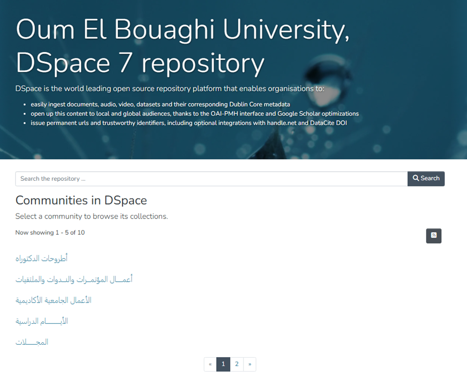 The digital repository of Oum El Bouaghi University is one of the university’s most prominent projects in the field of digital transformation and knowledge dissemination. The repository, which was launched in 2020, aims at collecting and archiving the intellectual and research output of teachers and students, and making it digitally accessible for viewing by researchers.