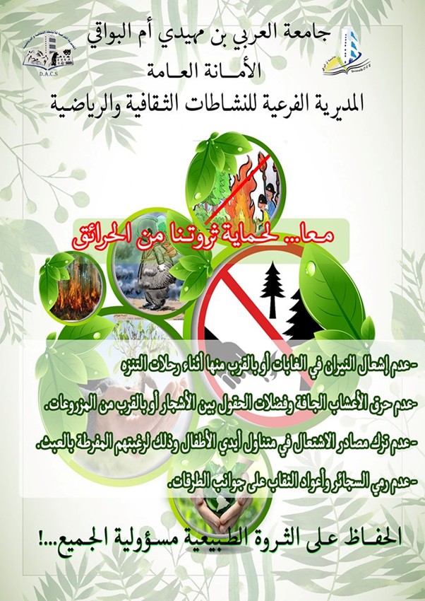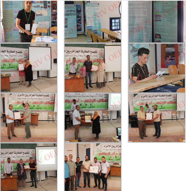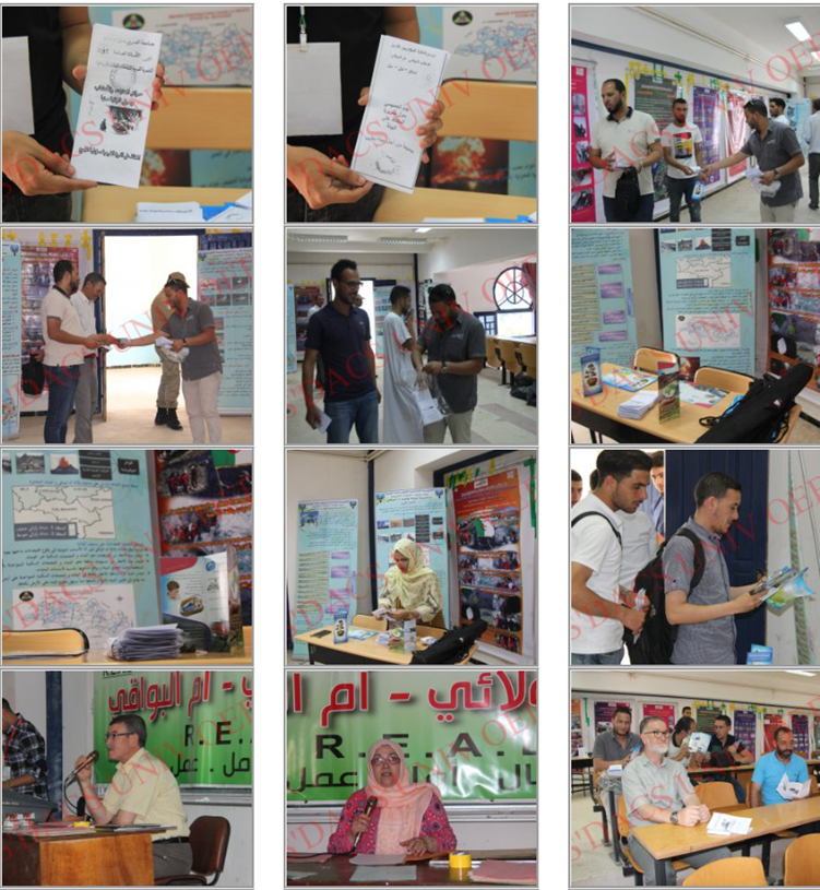 Continuing the awareness campaign regarding forest fire prevention and environmental conservation, the University’s Student Union of Free Algerian Students (REAL) in Oum El Bouaghi organized a public awareness day. The event emphasized the importance of environmental preservation and was conducted in coordination with the Directorate of Environment for Oum El Bouaghi Province. Professors from the University participated in this campaign. The event included the distribution of pamphlets and educational materials and showcased an exhibition of environmental photographs.