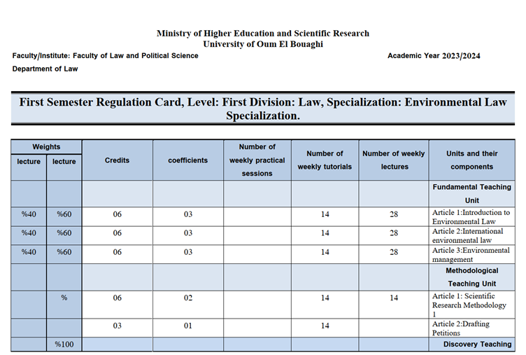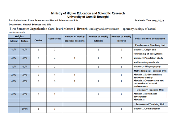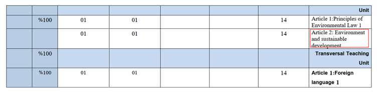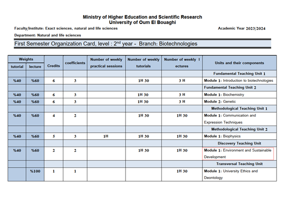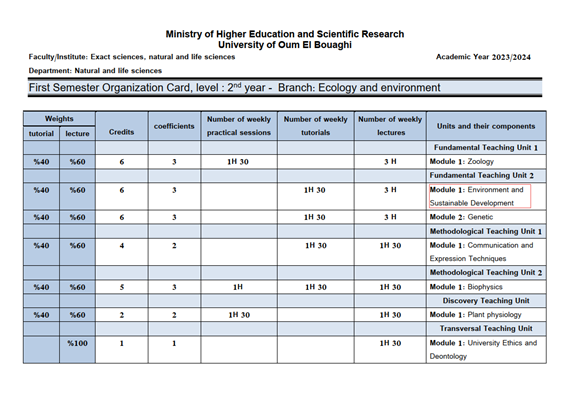 The University of Oum El Bouaghi has incorporated the principles of sustainable development into the curricula of several specializations. Consequently, the course materials have been designed to promote critical thinking and dialogue on sustainable development issues. These include: