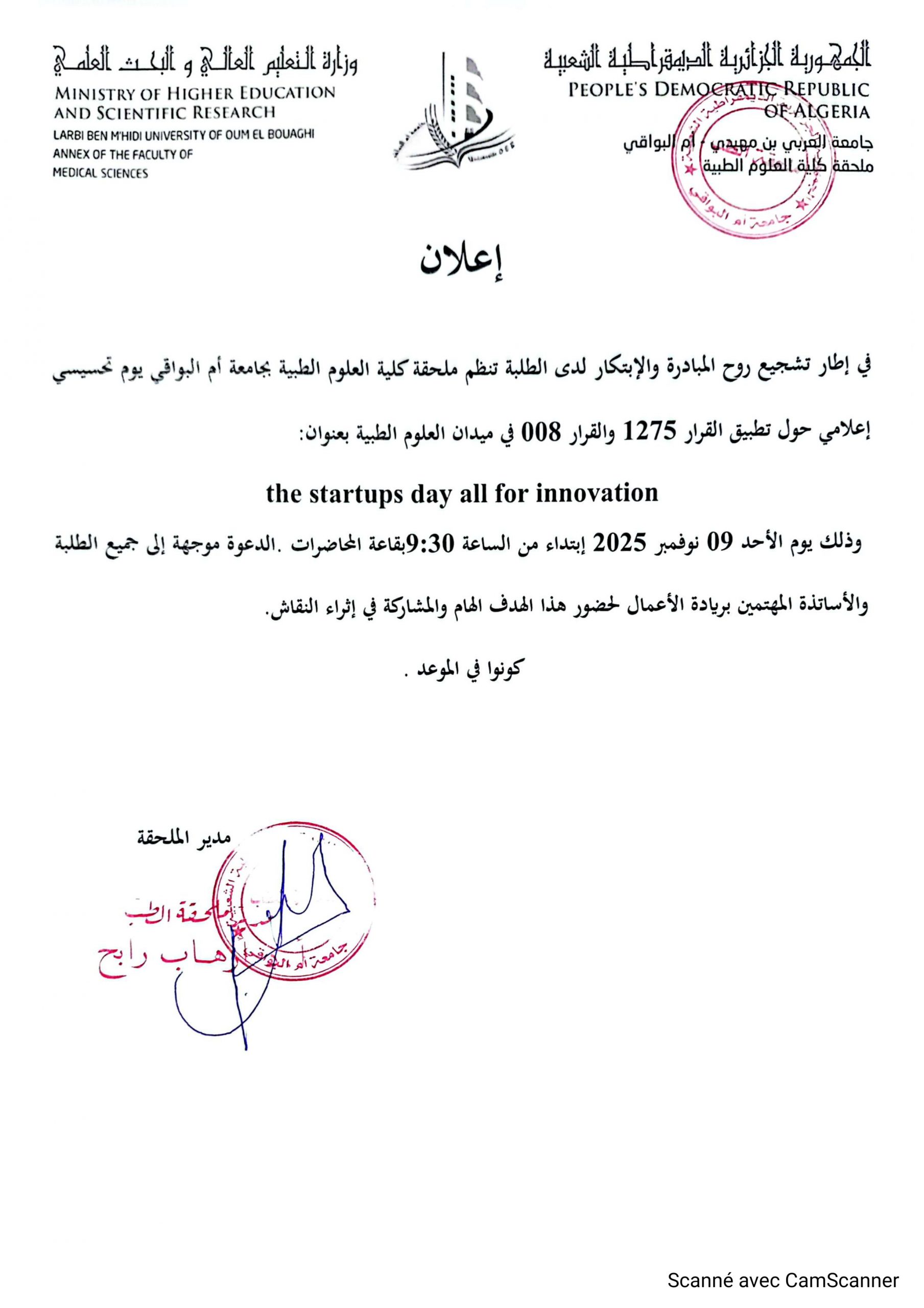 | تحت رعاية مدير جامعة أم البواقي تنظم حاضنة الأعمال الجامعية بالشراكة مع كليات ، معاهد ، ملحقة الطب ، و الأمانة العامة الجامعية يوم الأحد 9 نوفمبر 2025 اليوم الجامعي The STARTUPS DAY تحت شعار All for Innovation بالتوازي تنظيم 12 يوم دراسي في يوم واحد بمشاركة الأساتذة ، الطلبة و عمال و إطارات الجامعة مع المساهمة الفعالة لكل من مركز تطوير المقاولاتية ، دار الذكاء الاصطناعي ، مركز دعم التكنولوجيا و الابتكار ، مخبر التصنيع ، مركز التعليم المكثف لللغات ، البهو التكنولوجي ، و المديرية الفرعية للأنشطة العلمية الثقافية و الرياضية من أجل طالب مبتكر ، طالب مخترع ، طالب رائد للأعمال |
