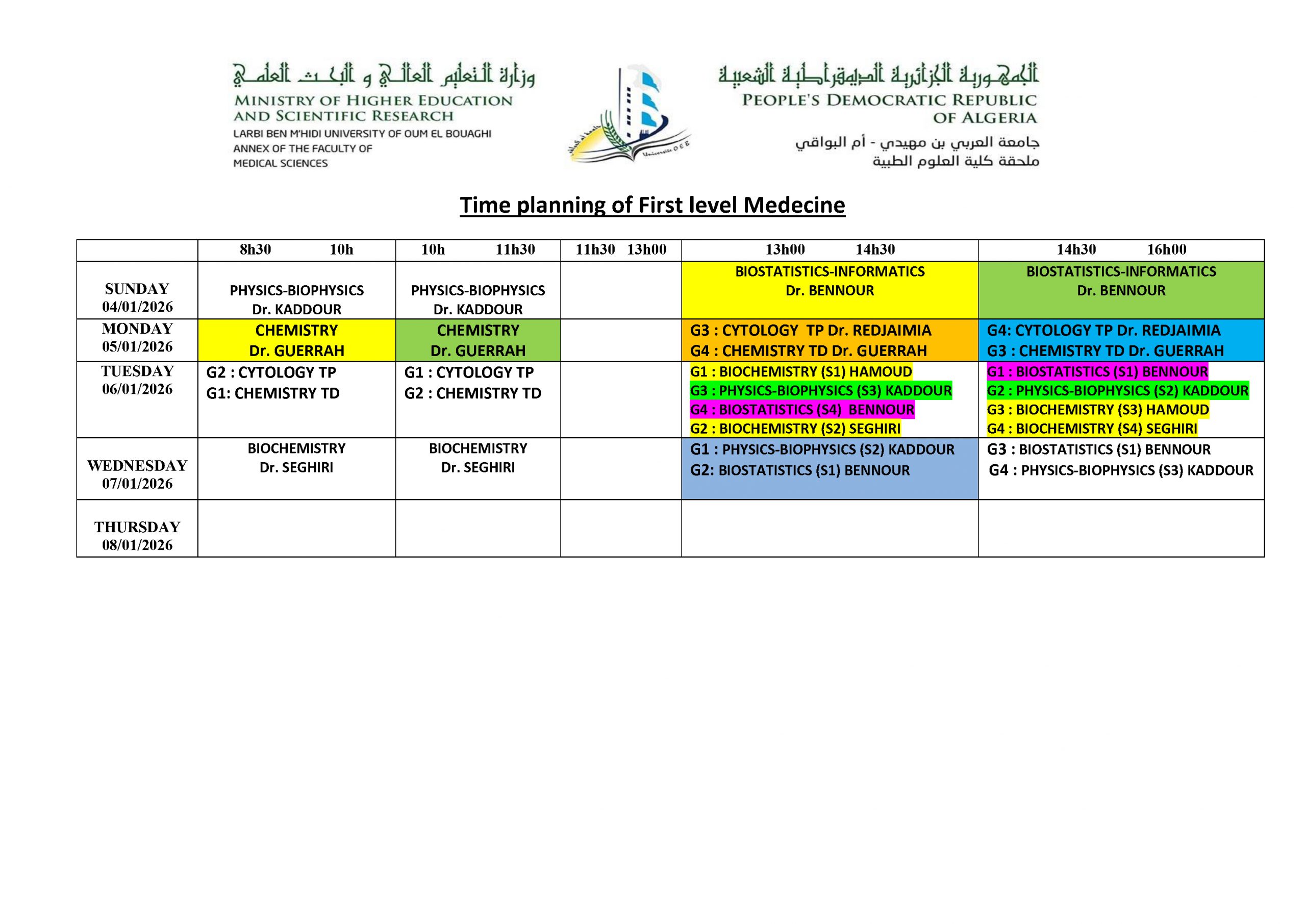 | TUESDAY 06/01/2026 | G2 : CYTOLOGY TP G1: CHEMISTRY TD | G1 : CYTOLOGY TP G2 : CHEMISTRY TD | G1 : BIOCHEMISTRY (S1) HAMOUD G3 : PHYSICS-BIOPHYSICS (S3) KADDOUR G4 : BIOSTATISTICS (S4) BENNOUR G2 : BIOCHEMISTRY (S2) SEGHIRI | G1 : BIOSTATISTICS (S1) BENNOUR G2 : PHYSICS-BIOPHYSICS (S2) KADDOUR G3 : BIOCHEMISTRY (S3) HAMOUD G4 : BIOCHEMISTRY (S4) SEGHIRI | |