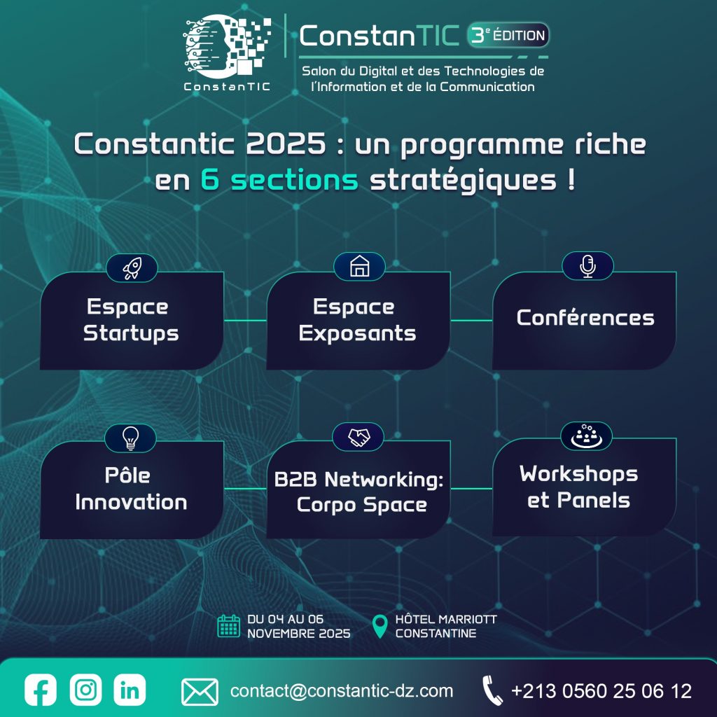 دعوة للأساتذة والطلبة المهتمين بمجال الرقمنة والتكنولوجيات الحديثة للمشاركة في المعرض الدولي الثالث للرقمنة وتقنيات المعلومات والاتصال، الذي سيُقام في فندق الماريوت بمدينة قسنطينة في الفترة الممتدة من 4 إلى 6 نوفمبر 2025.
