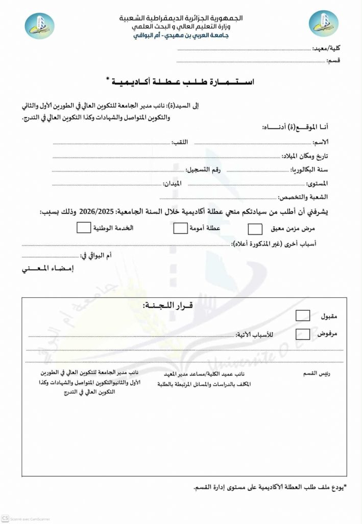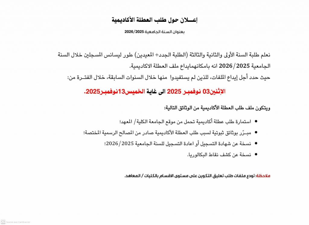 إعـــلان حول طلب العطلة الأكاديمية بعنوان السنة الجامعية 2025/2026