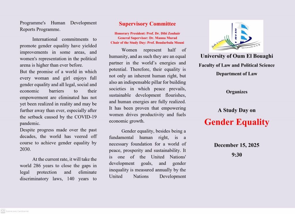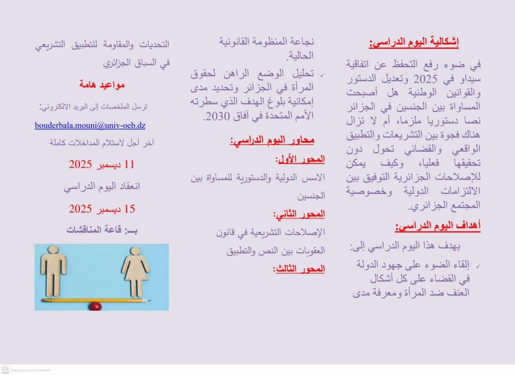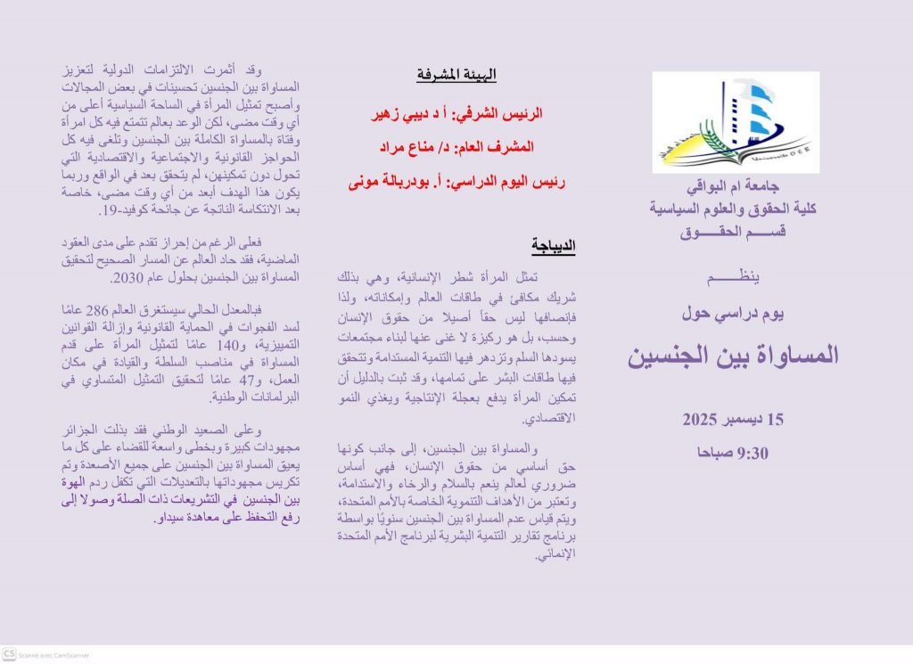 في إطار الأنشطة العلمية الهادفة إلى ترسيخ القيم الحقوقية وتعزيز الوعي المجتمعي بقضايا المساواة والعدالة، نظّمت كلية الحقوق والعلوم السياسية – قسم الحقوق، يوماً دراسياً بعنوان: “يوم دراسي حول المساواة بين الجنسين”، وذلك بحضور نخبة من الأساتذة والباحثين، إلى جانب طلبة الكلية والمهتمين بالشأن الحقوقي.