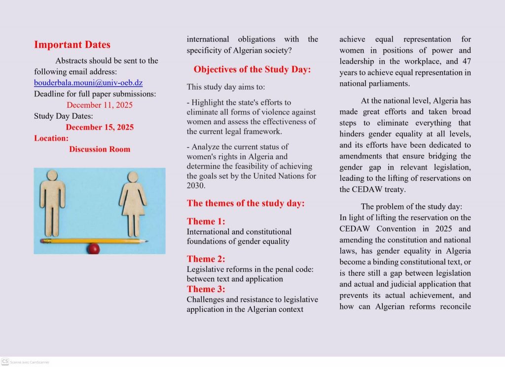 وقد تميز اليوم الدراسي بنقاشات ثرية وتفاعلات بنّاءة بين الأساتذة والطلبة، عكست مدى الاهتمام المتزايد بقضايا المساواة بين الجنسين وأهمية معالجتها من منظور قانوني وعلمي رصين.