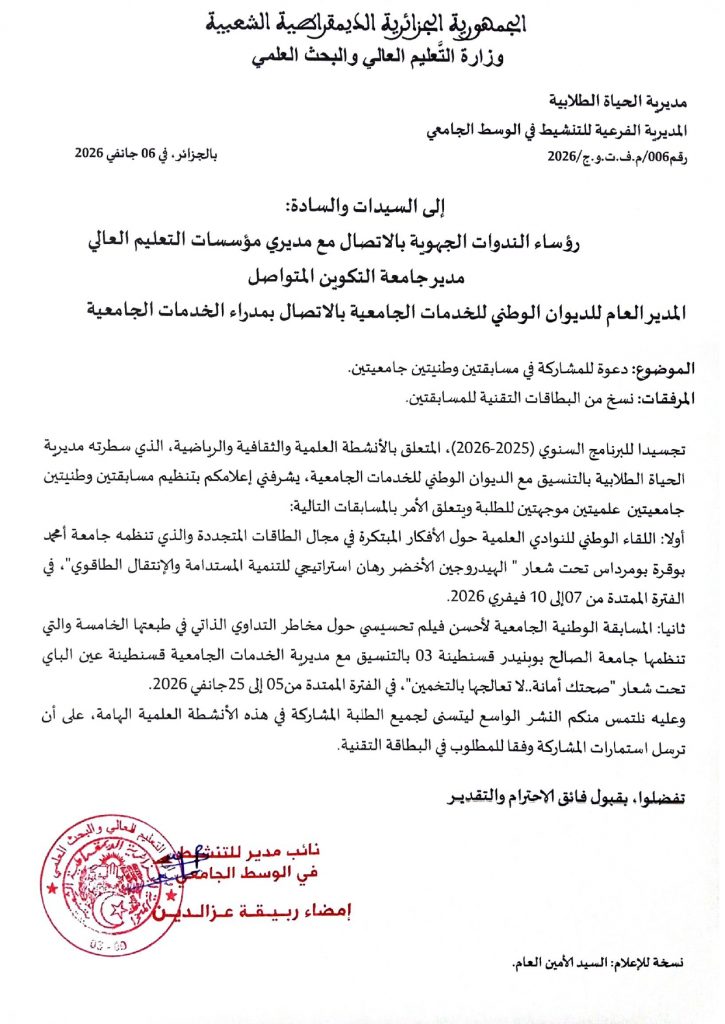 2. المسابقة الوطنية الجامعية لأحسن فيلم تحسيسي حول مخاطر التداوي الذاتي في طبعتها الخامسة والتي تنظمها جامعة الصالح بوبنيدر قسنطينة 03 بالتنسيق مع مديرية الخدمات الجامعية قسنطينة عين الباي تحت شعار “صحتك أمانة..لا تعالجها بالتخمين”، في الفترة الممتدة من 05 إلى 25 جانفي 2026.