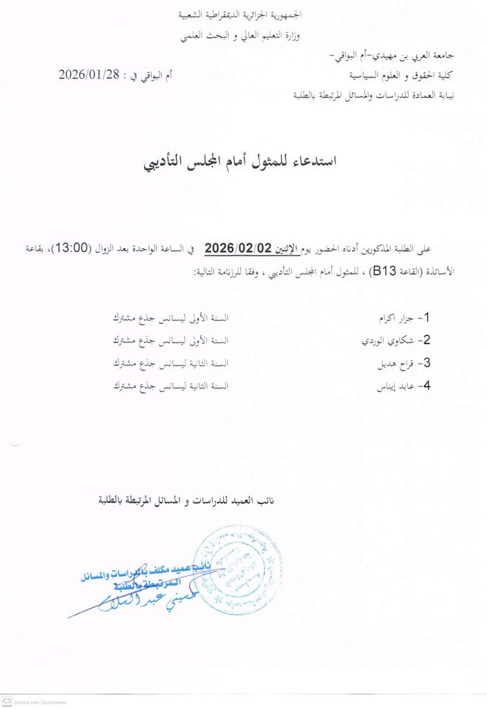 الرئيسية/فضاء الطالب/تعديل/ إستدعاء للمثول أمام المجلس التأديبي للكلية تعديل/ إستدعاء للمثول أمام المجلس التأديبي للكلية