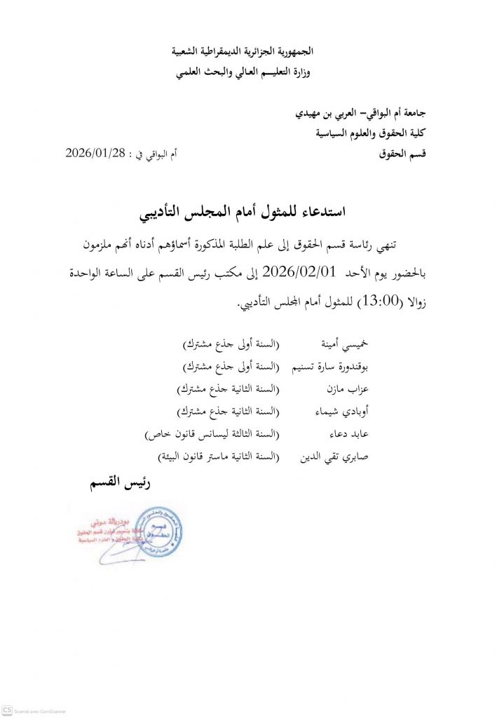 الرئيسية/فضاء الطالب/استدعاء للمثول أمام المجلس التأديبي لقسم الحقوق استدعاء للمثول أمام المجلس التأديبي لقسم الحقوق