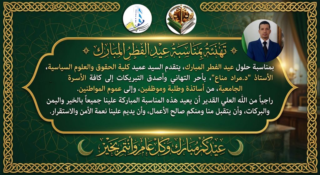الرئيسية/تهنئة/تهنئة السيد عميد الكلية بمناسبة عيد الفطر المبارك تهنئة السيد عميد الكلية بمناسبة عيد الفطر المبارك