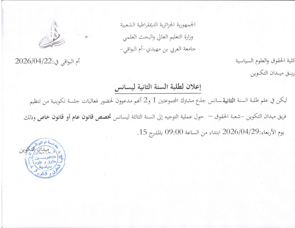 الرئيسية/ميدان التكوين/إعلان هام لطلبة السنة ثانلية ليسانس بخصوص عملية التوجيه للسنة الثالثة ليسانس إعلان هام لطلبة السنة ثانلية ليسانس بخصوص عملية التوجيه للسنة الثالثة ليسانس