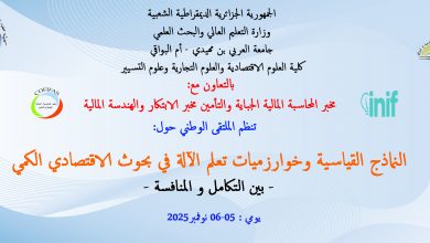الملتقى الوطني : ” النماذج القياسية وخوارزميات تعلم الآلة في بحوث الإقتصاد الكمي : بين التكامل والمنافسة”