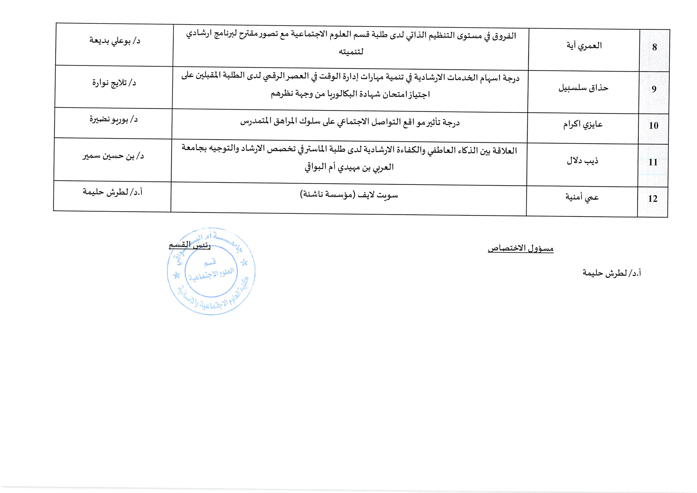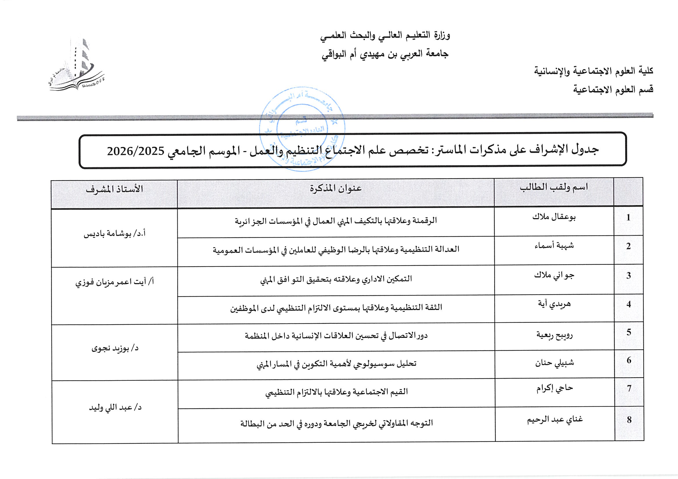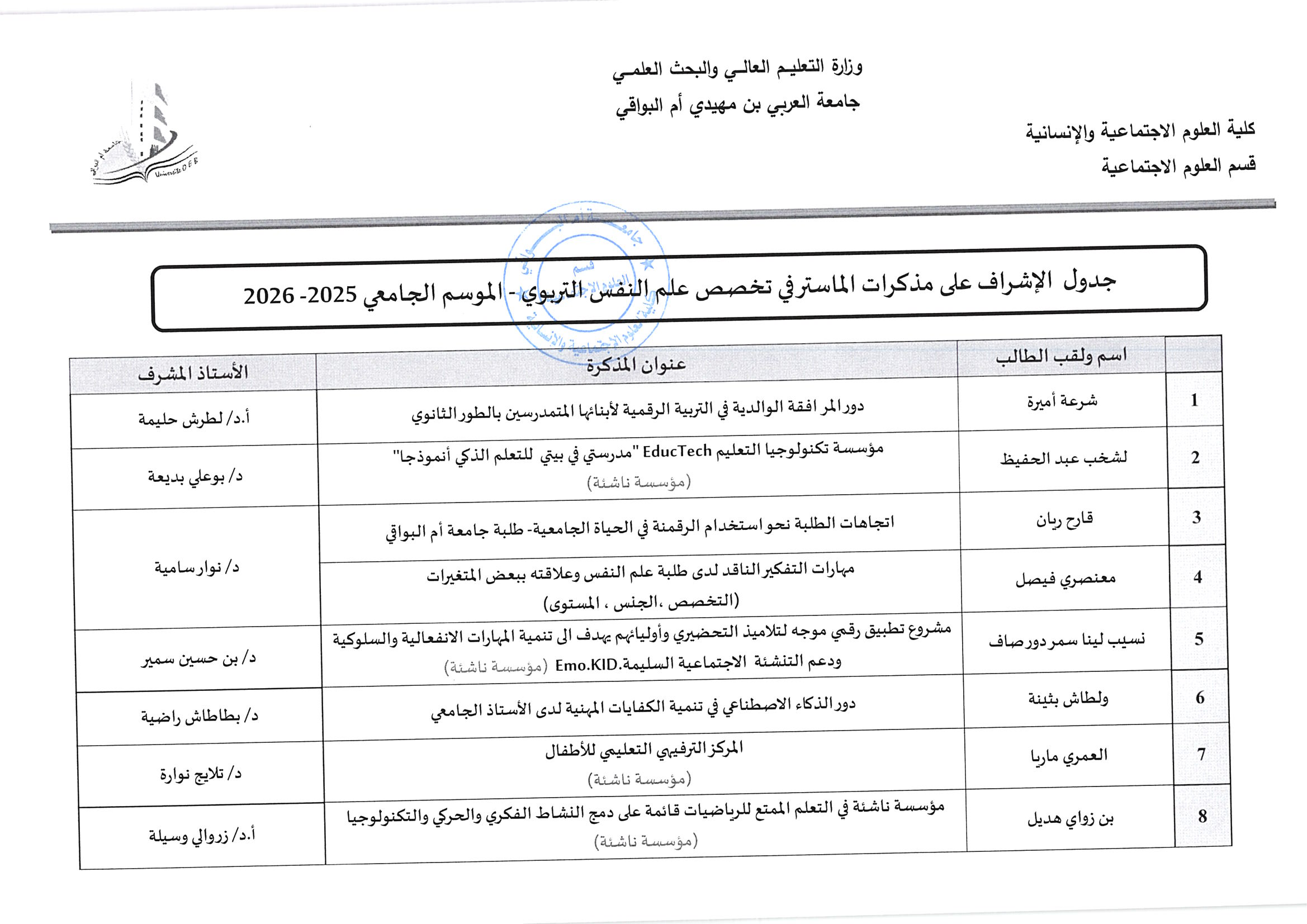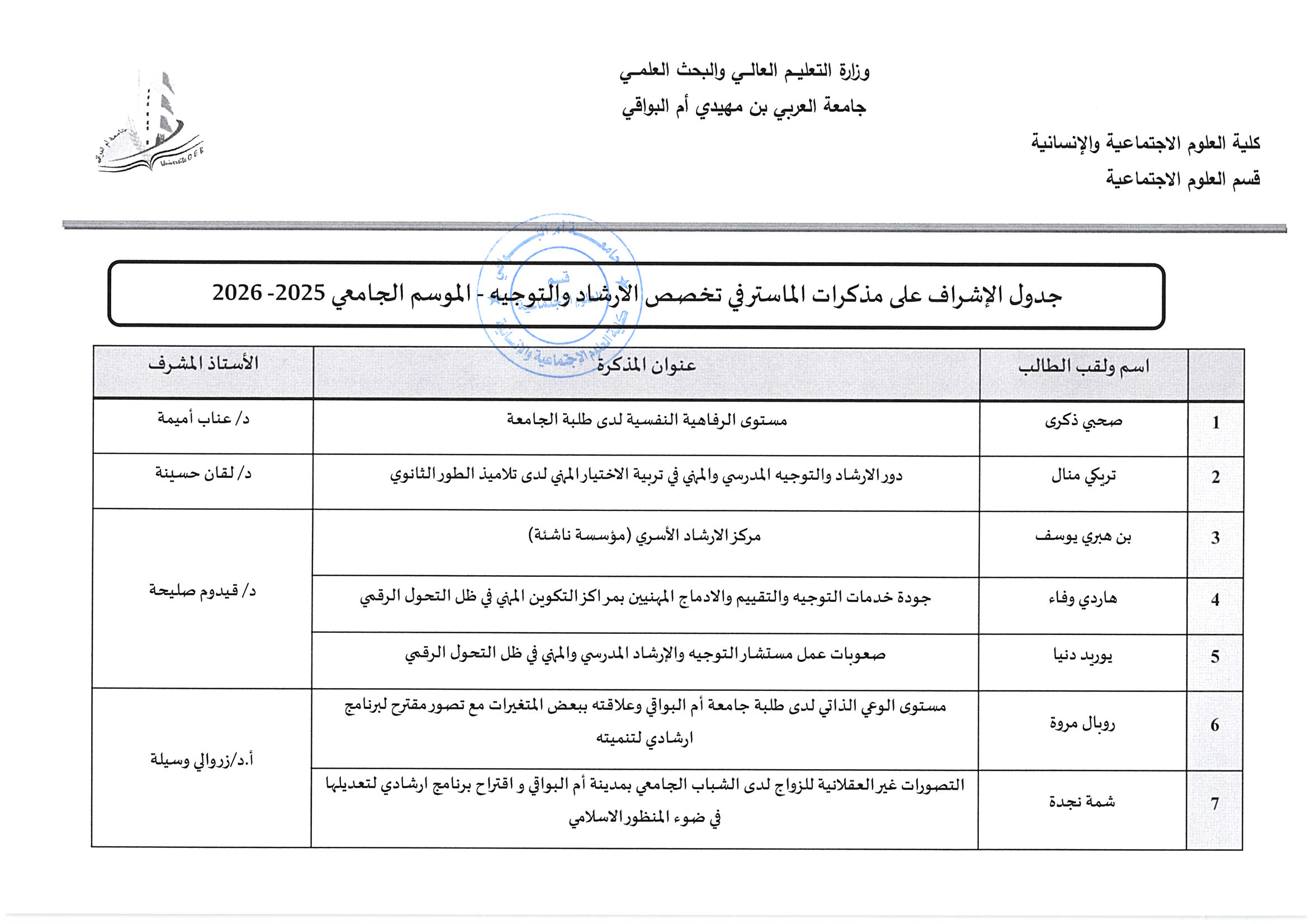 توزيع الإشراف النهائي لقسم العلوم الإجتماعية