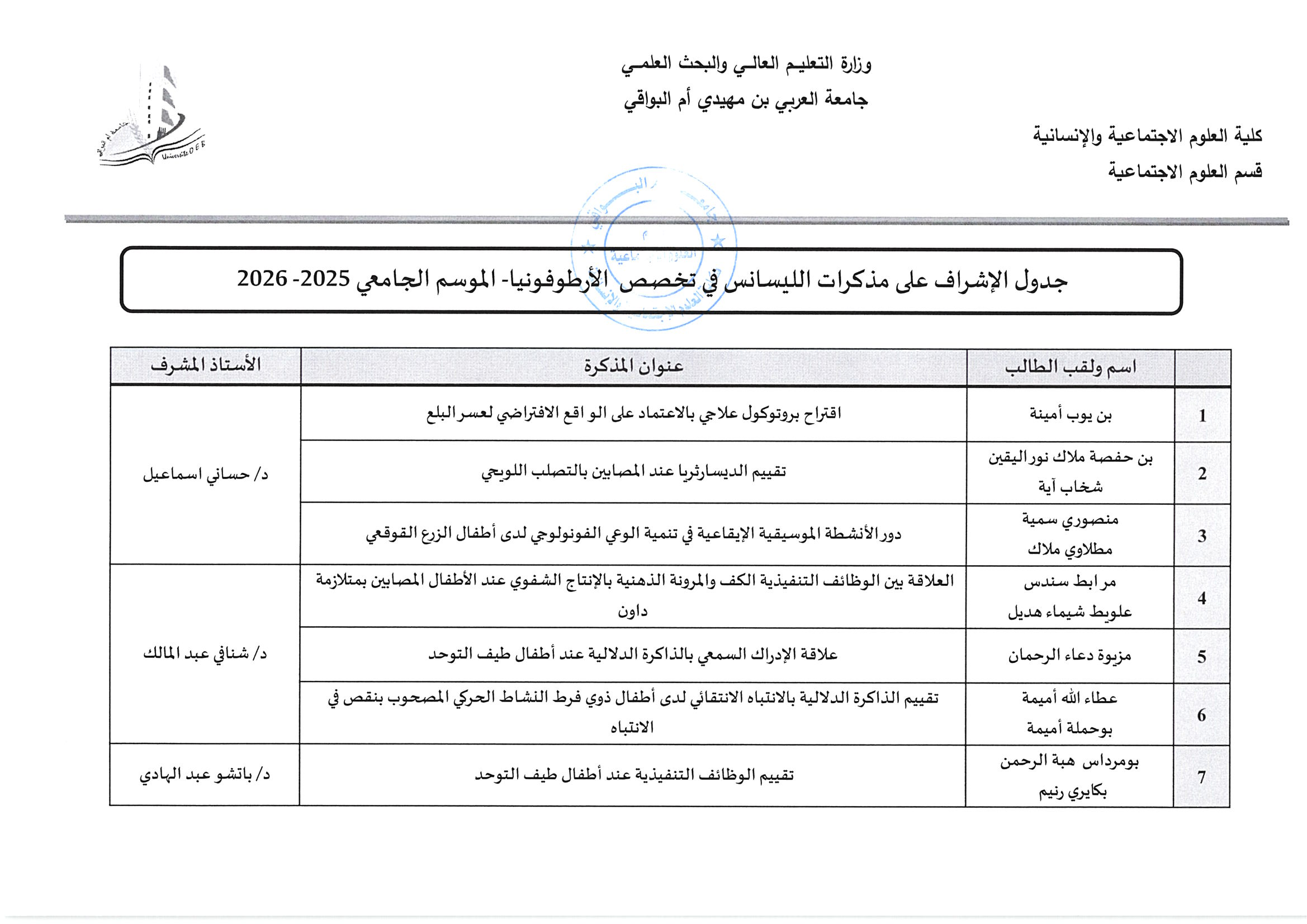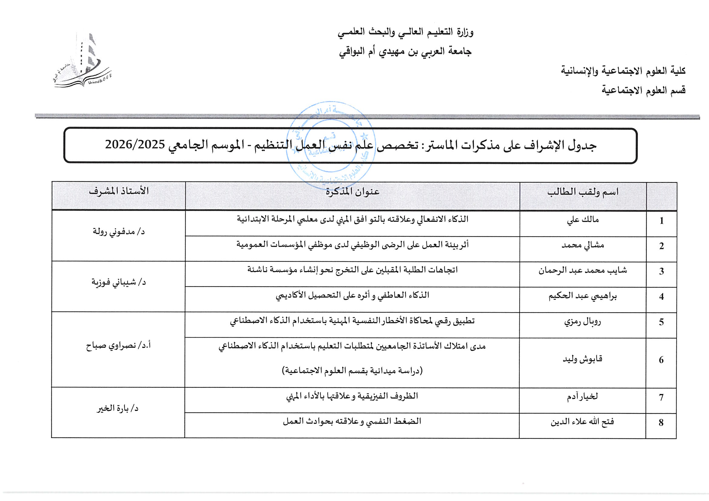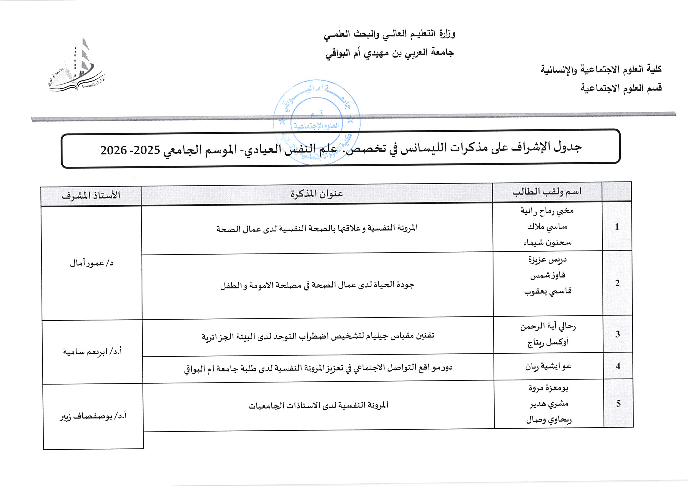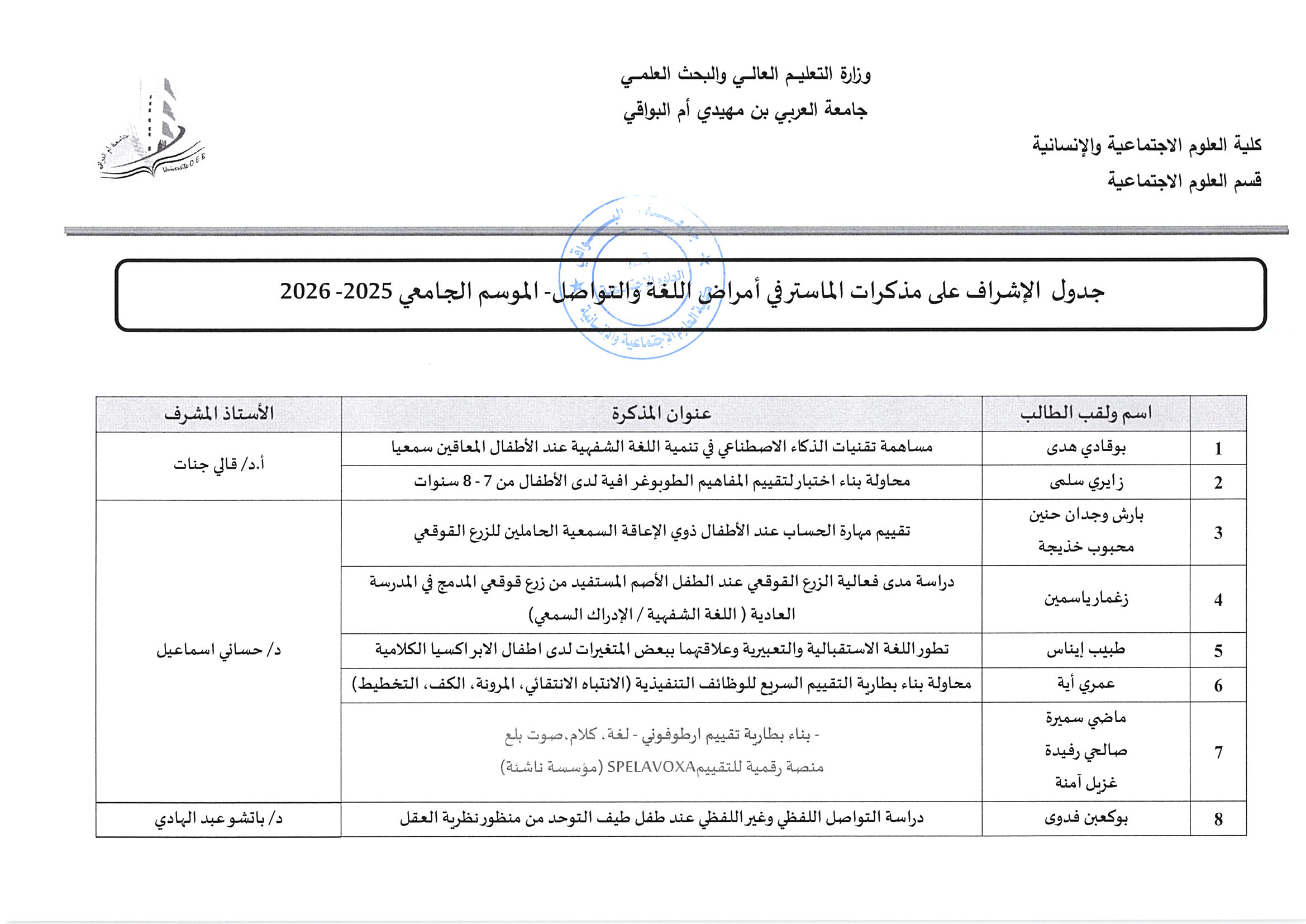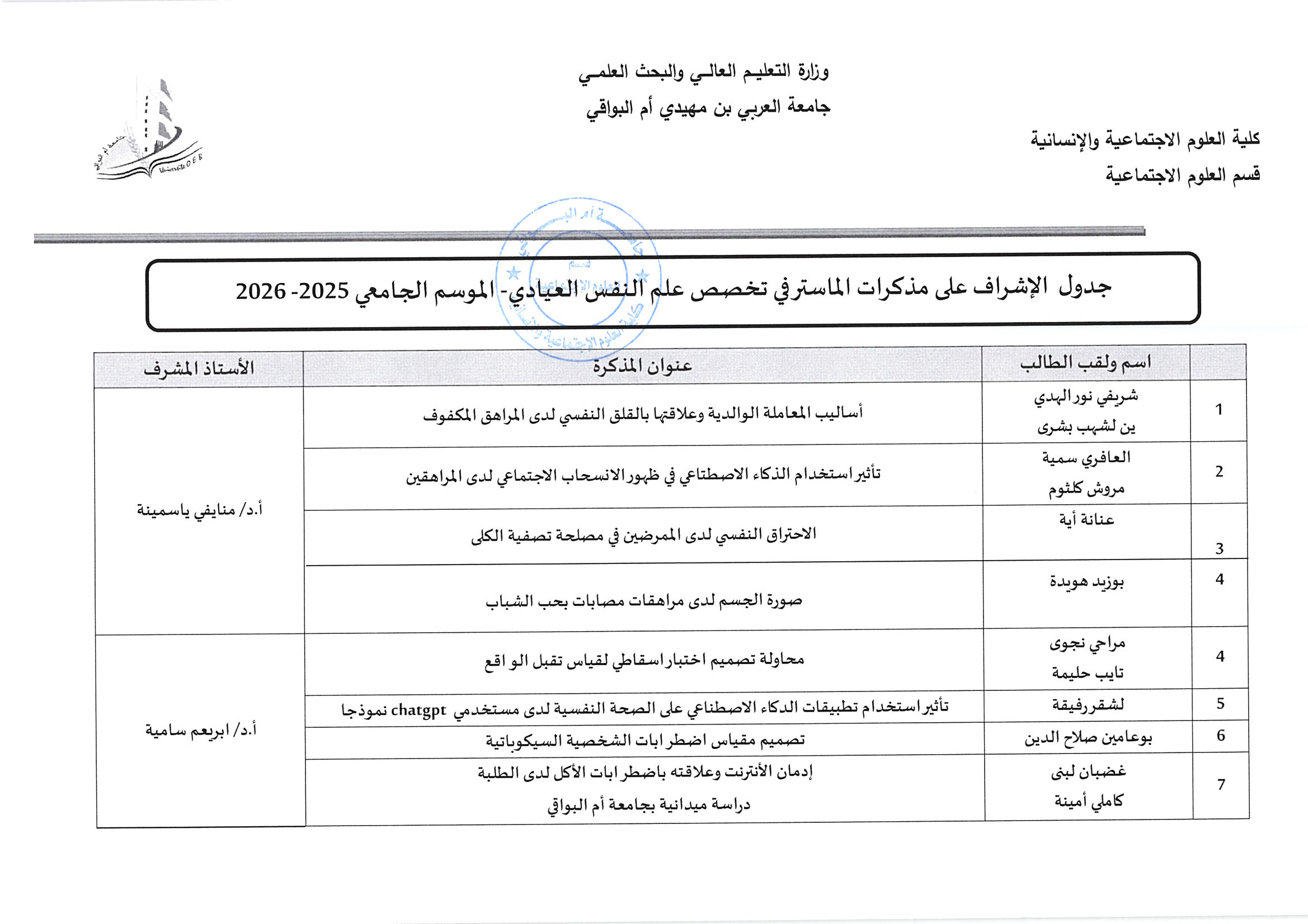 توزيع الإشراف النهائي لقسم العلوم الإجتماعية