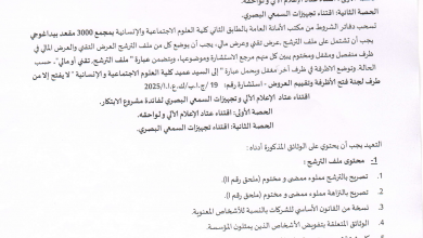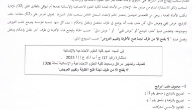 يعلن عميد كلية العلوم الاجتماعية والإنسانية بجامعة أم البواقي عن استشارة متعلقة بتنظيف و تطهير مرافق و محيط كلية العلوم…