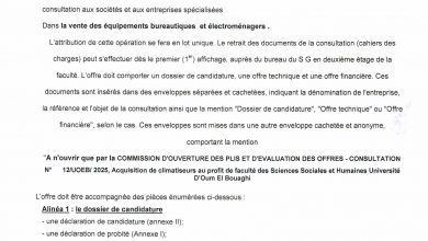 Avis de Consultation N°.07 /FSSH/UOEB/ 2025 Le doyen de la faculté, lance un avis de consultation aux operateurs économiques (détaillants-…