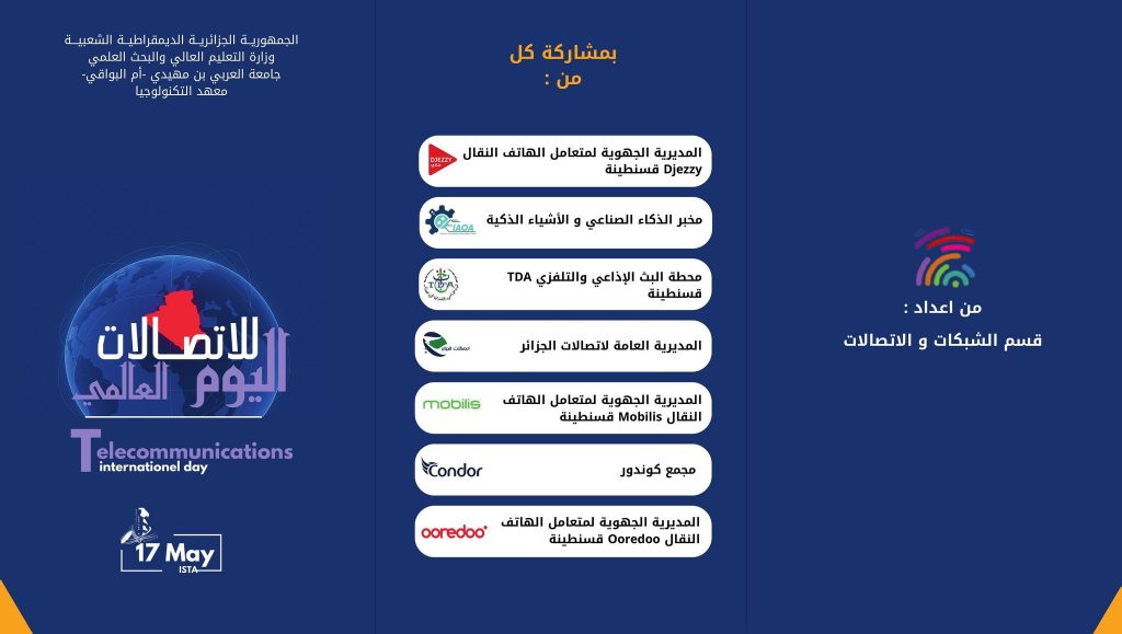 اليوم العالمي للاتصالات تتشرف هيئة تنطيم اليوم الدراسي الثالث حول الاتصالات بدعوة الجميع لحضور فعاليات الحدث بمعهد التكنولوجيا عين مليلة جامعة أم البواقي يوم السبت 17 ماي ابتداءا من الساعة الثامنة و النصف.