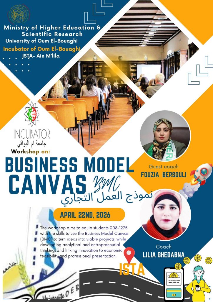 Workshop Incubator of Oum El-Bouaghi ISTA Ain M’lila Organizing a workshop on Business Model Canvas Wednesday, April 22, 2026; at 8:00 AM