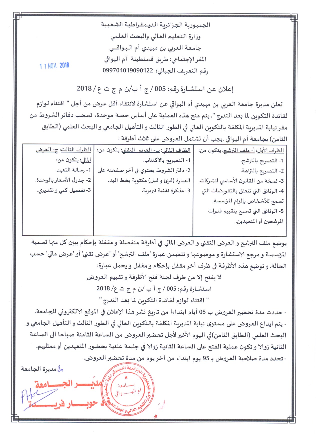 Equipement du campus des 1000 places pédagogiques à Ain M’Lila au profit de l’Institut des Sciences et Technologies Appliquées de l’université d’Oum El Bouaghi « , en lot unique, Lot 5 : Equipements de détection d’incendie.