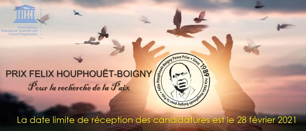 L’UNESCO invite les États membres de l’Organisation, ainsi que des personnes physiques et/ou morales intéressées, à soumettre une ou plusieurs candidatures au Prix Félix Houphouët-Boigny – UNESCO pour la recherche de la paix. L’UNESCO entend ainsi honorer les personnes vivantes, institutions ou organismes publics ou privés en activité, ayant contribué, de manière significative, à la promotion, à la recherche, à la sauvegarde ou au maintien de la paix, dans le respect de la Charte des Nations Unies et de l’Acte constitutif de l’UNESCO.