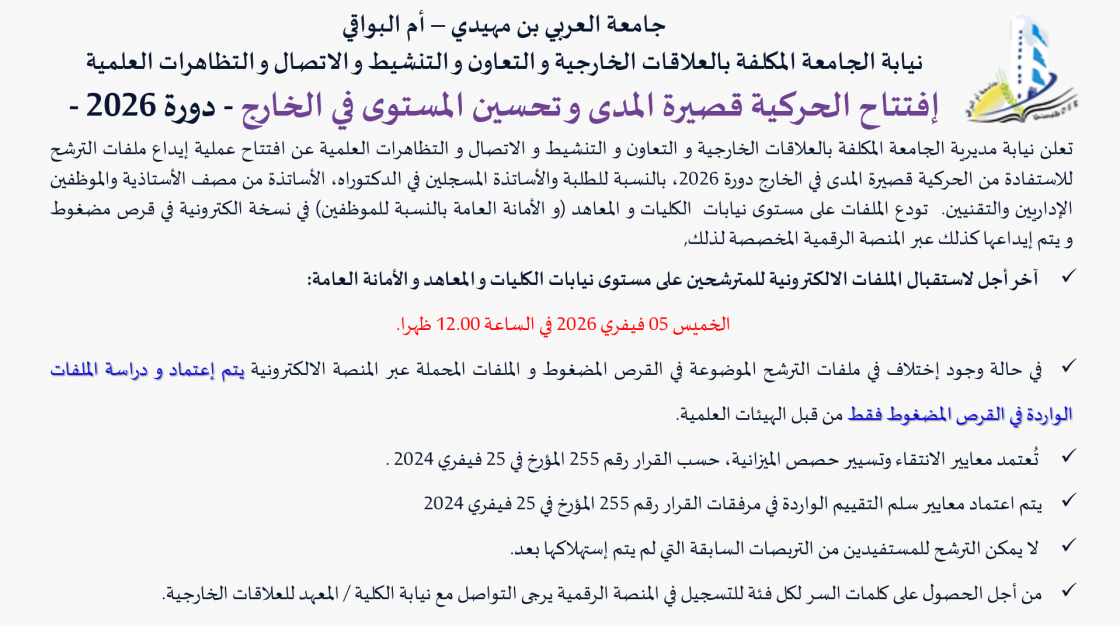 الحركية قصيرة المدى و تحسين المستوى في الخارج – دورة 2026 قرار رقم 255 المؤرخ في 25 فيفري 2024 الذي يحدد معايير الانتقاء للقبول في برنامج الحركية قصيرة المدى في الخارج سلم تقييم للمشاركة في التظاهرات العلمية الدولية خاص بالمؤسسات الجامعية والمدارس سلم تقييم مخصص لفئة الموظفين الإداريين والتقنيين بالمؤسسات الجامعية والمدارس سلم تقييم الاقامة العلمية قصيرة المدى ذات المستوى العالي خاص بالمؤسسات الجامعية والمدارس سلم تقييم تربص تحسين المستوى بالخارج خاص بالمؤسسات الجامعية والمدارس روابط الترشح عبر المنصة الرقمية إقامة علمية قصيرة المدى ذات مستوى عالي الاساتذة - الاساتذة المحاضرين قسم ا - الاساتذة المحاضرين قسم ب الرابط: الدخول إلى استمارة الترشح الرقمية تربص تحسين المستوى بالخارج بوابة الترشح للأساتذة الباحثين في طور تحضير الدكتوراه وطلبة الدكتوراه غير الأجراء (تفرغ تام) رابط التسجيل فئة الموظفين الإداريين والتقنيين رابط التسجيل تظاهرة علمية دولية الأساتذة والأساتذة المحاضرون (صنف أ و ب) رابط التسجيل الأساتذة الباحثون المسجلون في الدكتوراه وطلبة الدكتوراه غير الأجراء رابط التسجيل تنبيه هام (CD)يرجى التأكد من أن جميع الطلبات المقدمة رقمياً مرفقة بالملفات الورقية المطلوبة على قرص مضغوط والتي يجب إيداعها لدى أقسامكم المعنية في أجل أقصاه 05 فيفري 2026