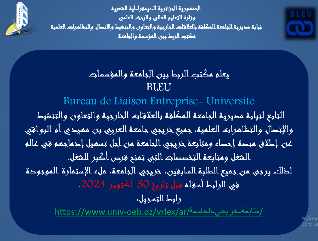 متابعة خريجي الجامعة متابعة خريجي جامعة العربي بن مهيدي أم البواقي إحصاء إدماج خريجي الجامعة السنة الدراسيةالاعلانرابط استمارة التسجيل 2023https://forms.gle/aycxdQCfi3KBJXcS7 2024https://forms.gle/X52VHk7ZNw8tCV8V6