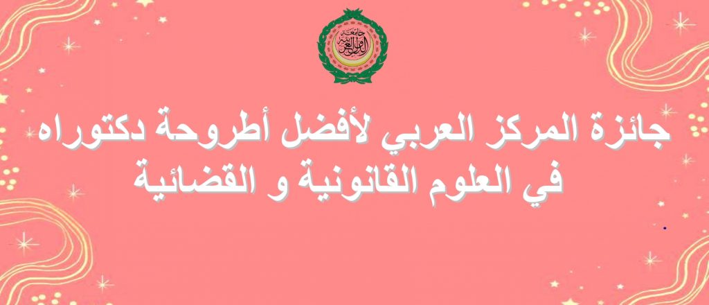 بدعم مباشر و إشراف مجلس وزراء العدل العرب، يُعلَن عن انطلاق جائزة المركز العربي لأفضل أطروحة دكتوراه في العلوم القانونية و القضائية في الوطن العربي.