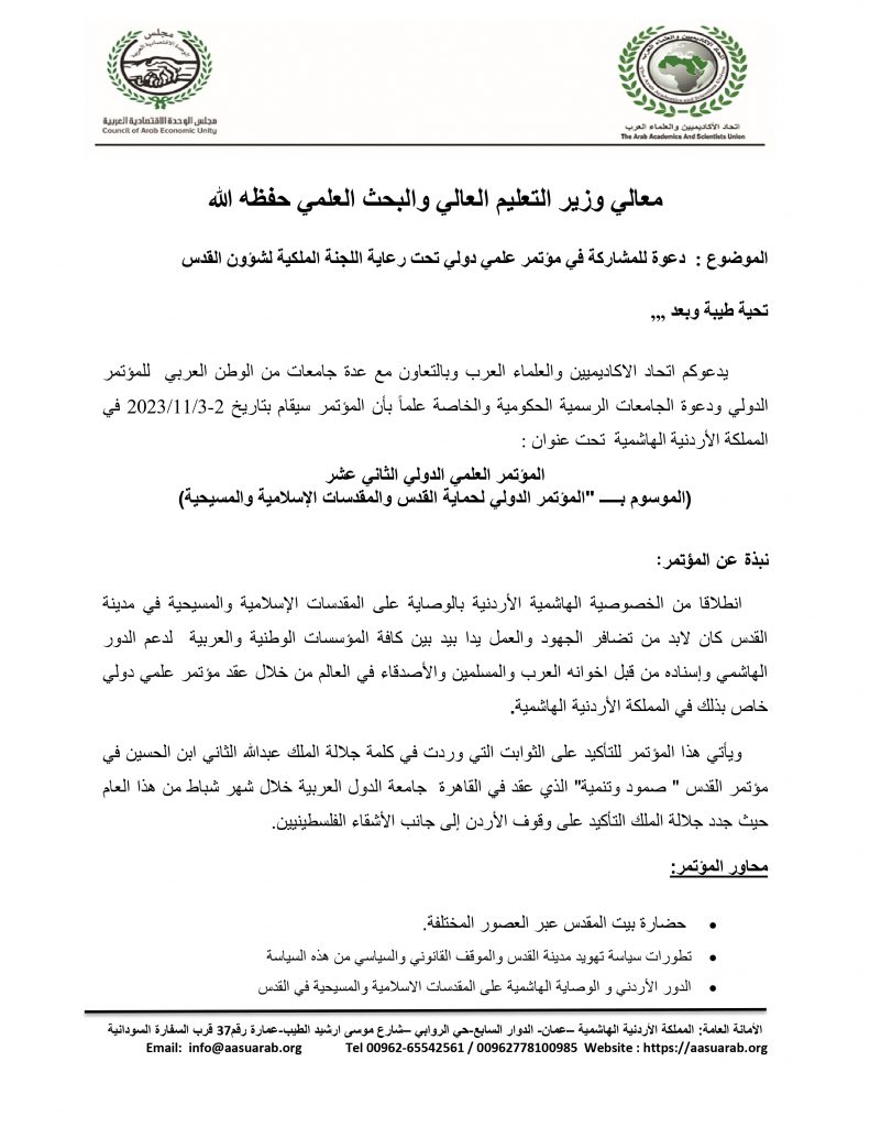 المؤتمر الدولي لحماية القدس والمقدسات الإسلامية والمسيحية دعوة للمشاركة في المؤتمر العلمي الدولي الثاني عشر الموسوم بـــــ المؤتمر الدولي لحماية القدس والمقدسات الإسلامية والمسيحية للتواصل :conferences@jaasu.orgتواريخ مهمة:أخر موعد لتقديم الملخصات : 2023/3/15أخر موعد لتقديم الأبحاث الكاملة : 2023/10/15