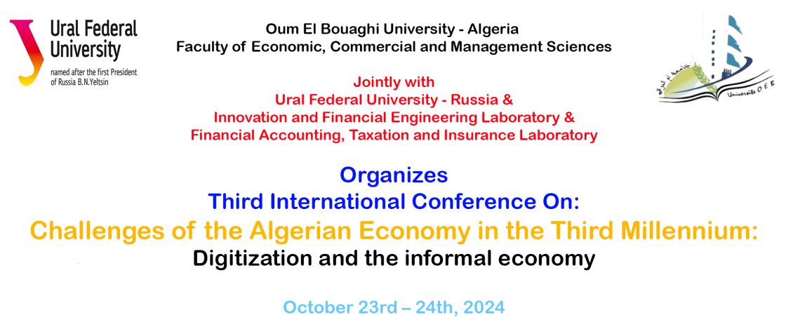 Challenges of the Algerian Economy in the Third Millennium: Digitization and the informal economy With the collaboration of the Ural Federal University Third International Conference On Challenges of the Algerian Economy in the Third Millennium: Digitization and the informal economy To Download: Dépliant fr Dépliant En Dépliant Ar Paper SubmissionProspective authors are invited to submit their papers written in English: The full papers should be submitted in the template below for conferences via: Template Chargement…