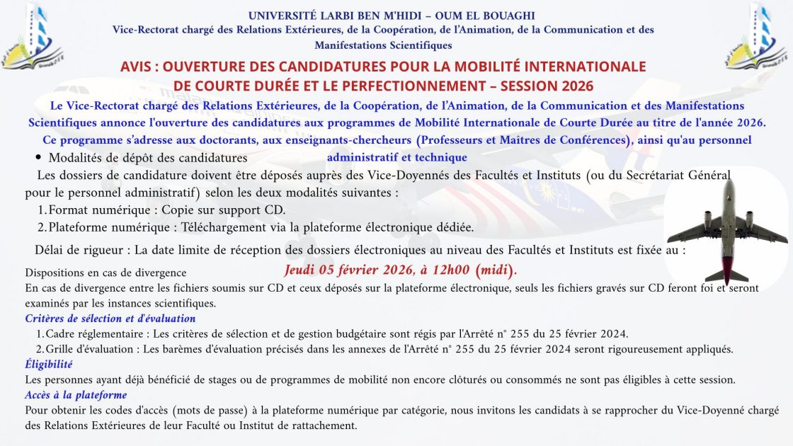 Mobilité Internationale de Courte Durée et Perfectionnement à l’Étranger – Session 2026 Arrêté n° 255 du 25 février 2024, fixant les critères de sélection d'admissibilité au programme de mobilité internationale de courte durée.Grille d'évaluation des séjours scientifiques de courte durée de haut niveau, spécifique aux universités et aux écoles. Grille d'évaluation des séjours scientifiques de courte durée de haut niveau, spécifique aux universités et aux écoles. Grille d'évaluation des stages de perfectionnement à l'étranger, spécifique aux universités et aux écoles. Grille d'évaluation pour la participation aux manifestations scientifiques internationales, spécifique aux universités et aux écoles. Grille d'évaluation destinée aux personnels administratifs et techniques des universités et des écoles. Liens de candidature sur la plateforme numérique Séjour scientifique de courte durée de haut niveau (SSCD) Maîtres de Conférences Classe B, Professeurs, et Maîtres de Conférences Classe A. Accéder au formulaire de candidature numérique Stage de perfectionnement à l'étranger Portail de candidature pour les enseignants-chercheurs en préparation de doctorat et les doctorants non-salariés (à temps plein) Lien d’inscription pour la catégorie Lien dédié aux personnels administratifs et techniques Lien d’inscription pour la catégorie des personnels administratifs et techniques Manifestation scientifique internationale Professeurs et Maîtres de Conférences (Classes A et B) Accéder au formulaire pour le stage de perfectionnement Enseignants-chercheurs inscrits en doctorat et doctorants non-salariés Lien pour les enseignants-chercheurs en doctorat et doctorants non-salariés Important :Veuillez vous assurer que toutes les soumissions numériques sont accompagnées des fichiers physiques requis sur support CD, à déposer auprès de vos départements respectifs avant la date limite du 05 février 2026.