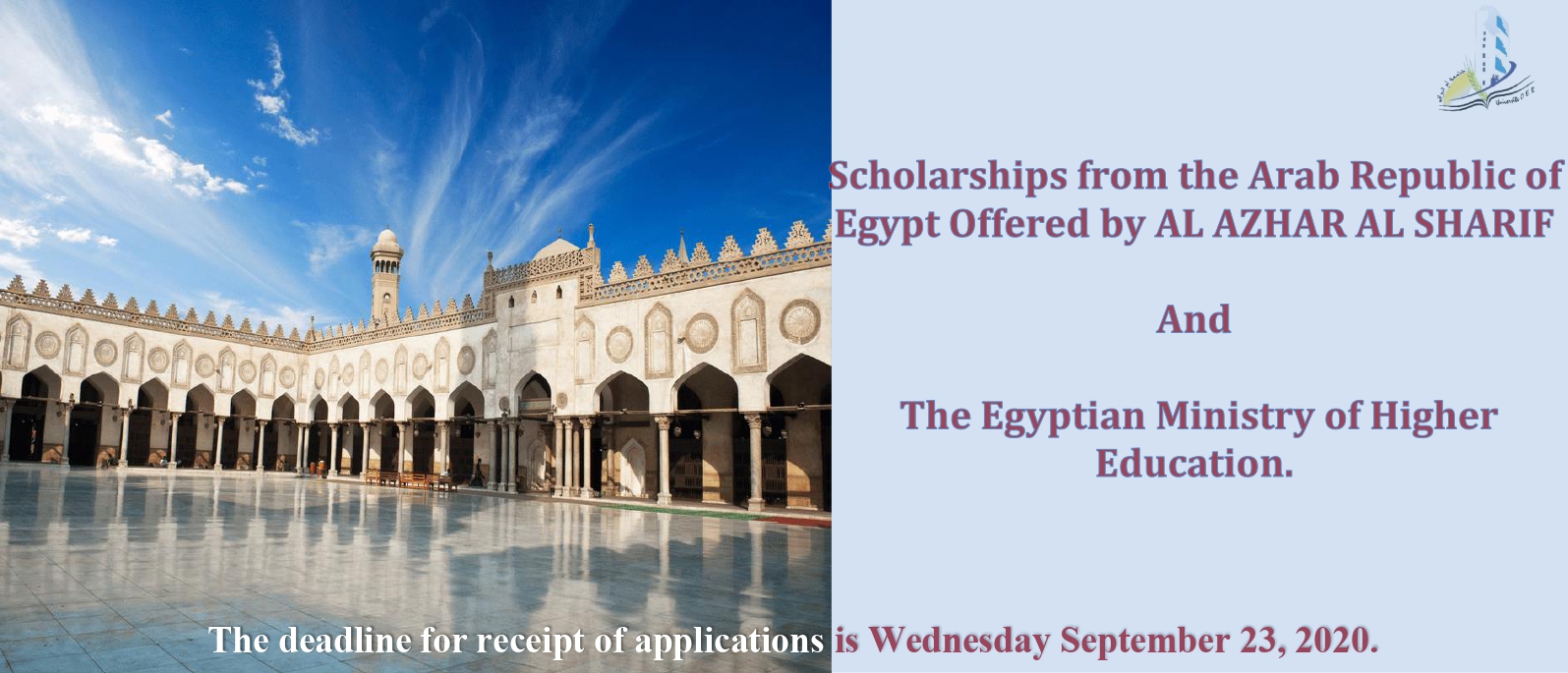 Scholarships From the Arab Republic of Egypt Scholarships from Arab Republic of Egypt offered by AL AZHAR AL SHARIF And The Egyptian Ministry of Higher Education The deadline for receipt of application at the level of the Vice Rectorate of External Relations is Wednesday September 23, 2020 To Download * Information form * Endorsement * AL AZHAR AL SHARIF scholarships